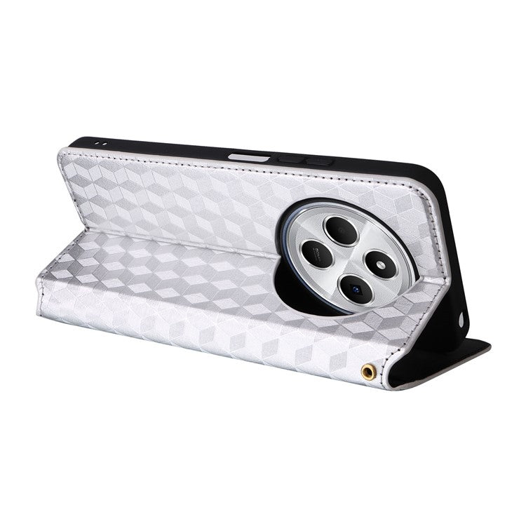 For Xiaomi Poco C75 4G / Redmi 14R 5G / 14C 4G / A4 5G Wallet Case Rhombus Imprinted Leather Phone Cover - Silver