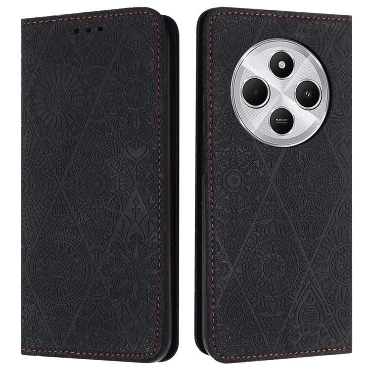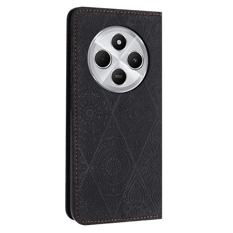 For Xiaomi Poco C75 4G / Redmi 14R 5G / 14C 4G Case Imprinted Flower Wallet Stand Leather Phone Cover - Black