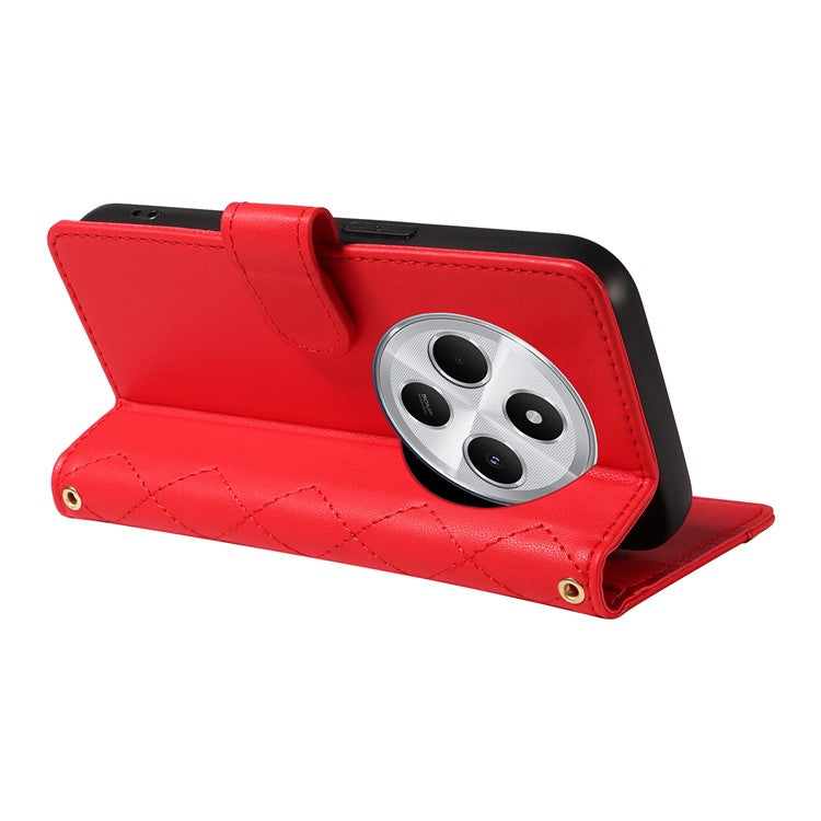 For Xiaomi Poco C75 4G / Redmi 14R 5G / 14C 4G Case Wallet Rhombus Leather Phone Cover with Shoulder Strap, Wrist Strap - Red