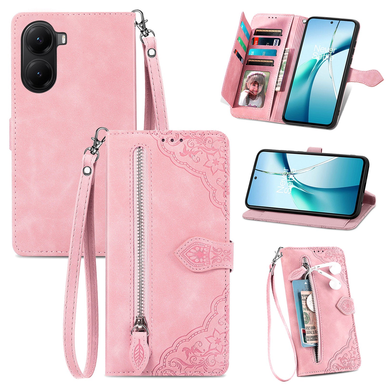 For Xiaomi Redmi Turbo 4 5G / Realme X7 Pro Zipper Wallet Case with Strap Flower Imprint PU Leather Phone Cover - Pink