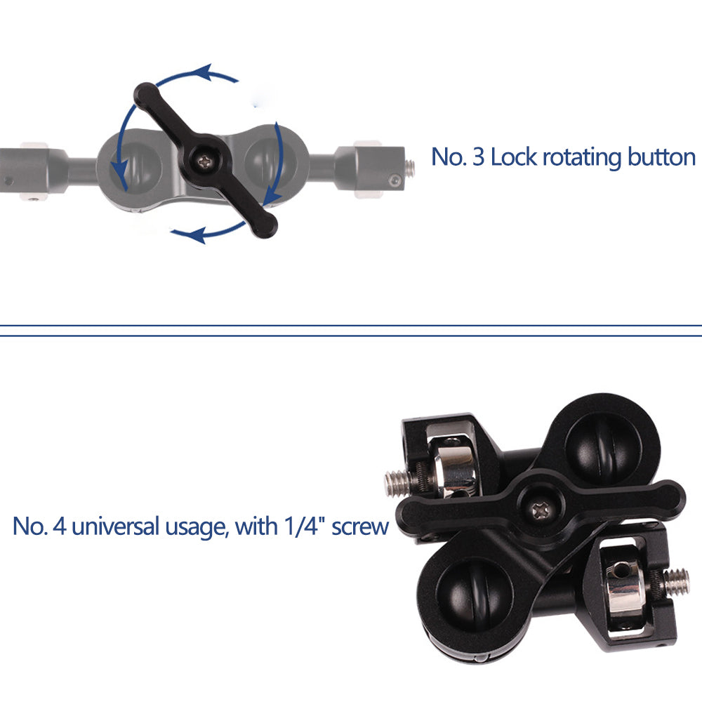 - Locking Knob: Aluminum alloy knob, clockwise rotation to lock the two ball heads fixed angle counterclockwise rotation to adjust the rotation angle