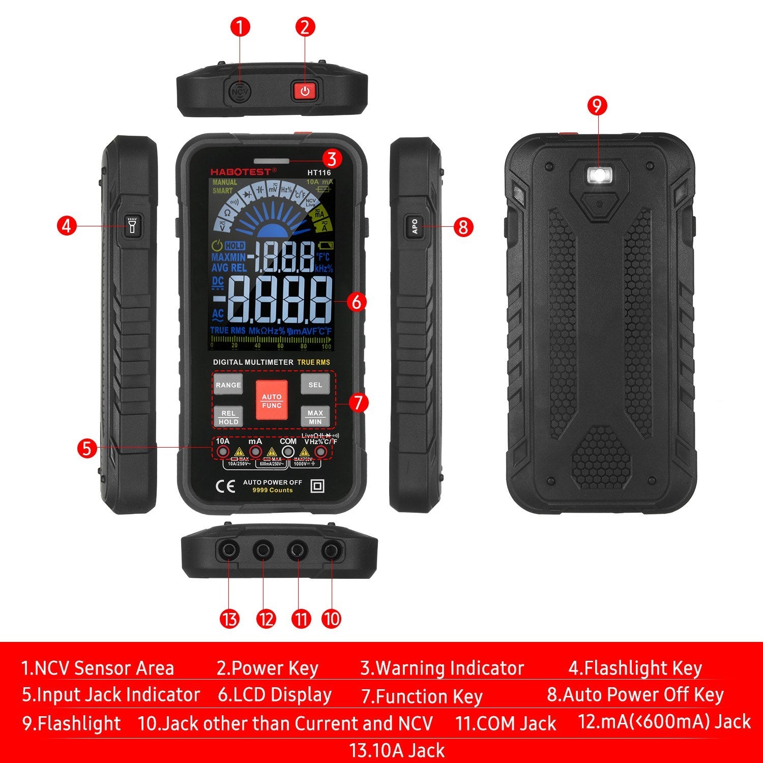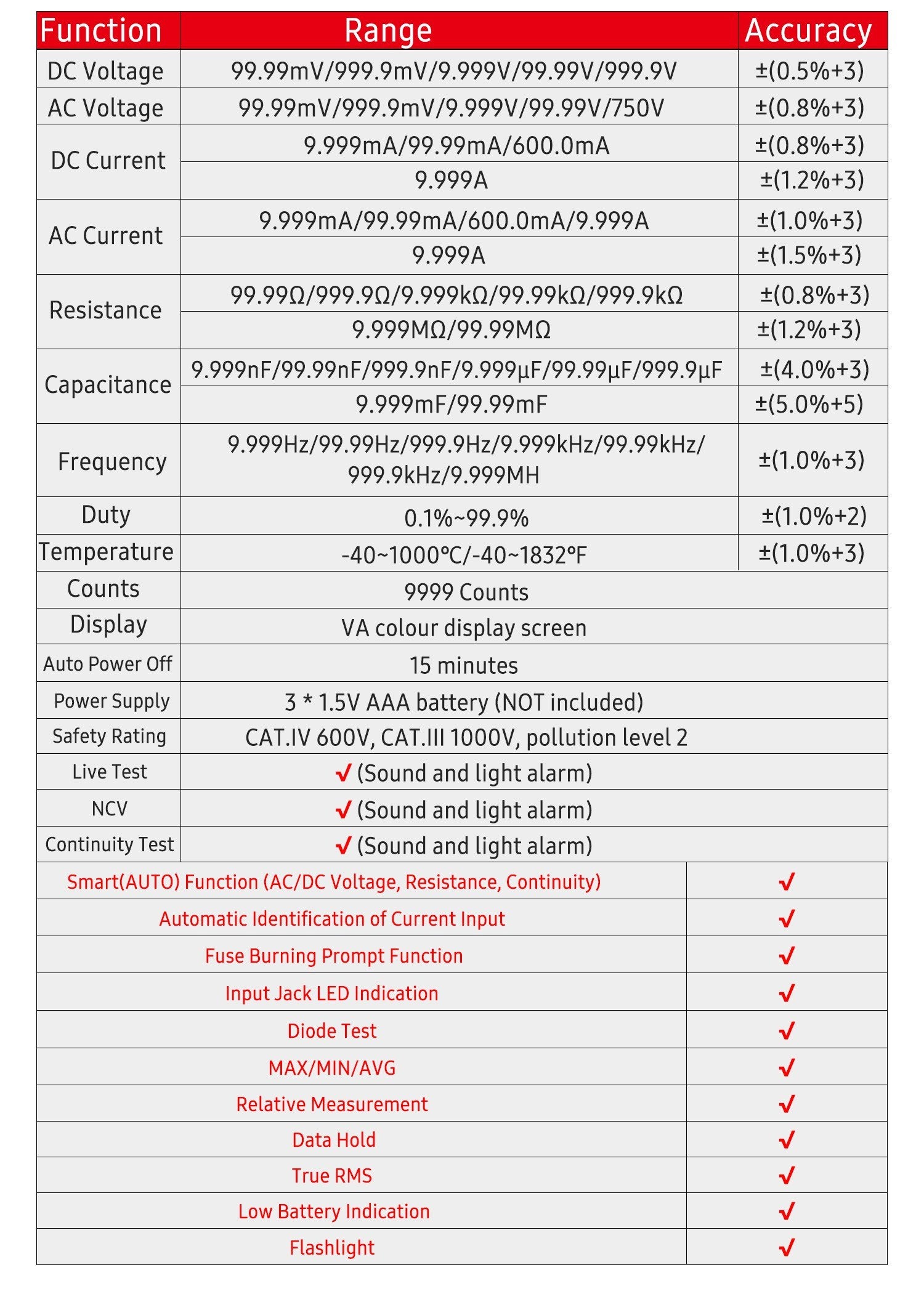 - AC/DC Current: 9.999mA/99.99mA/600.0mA/9.999A