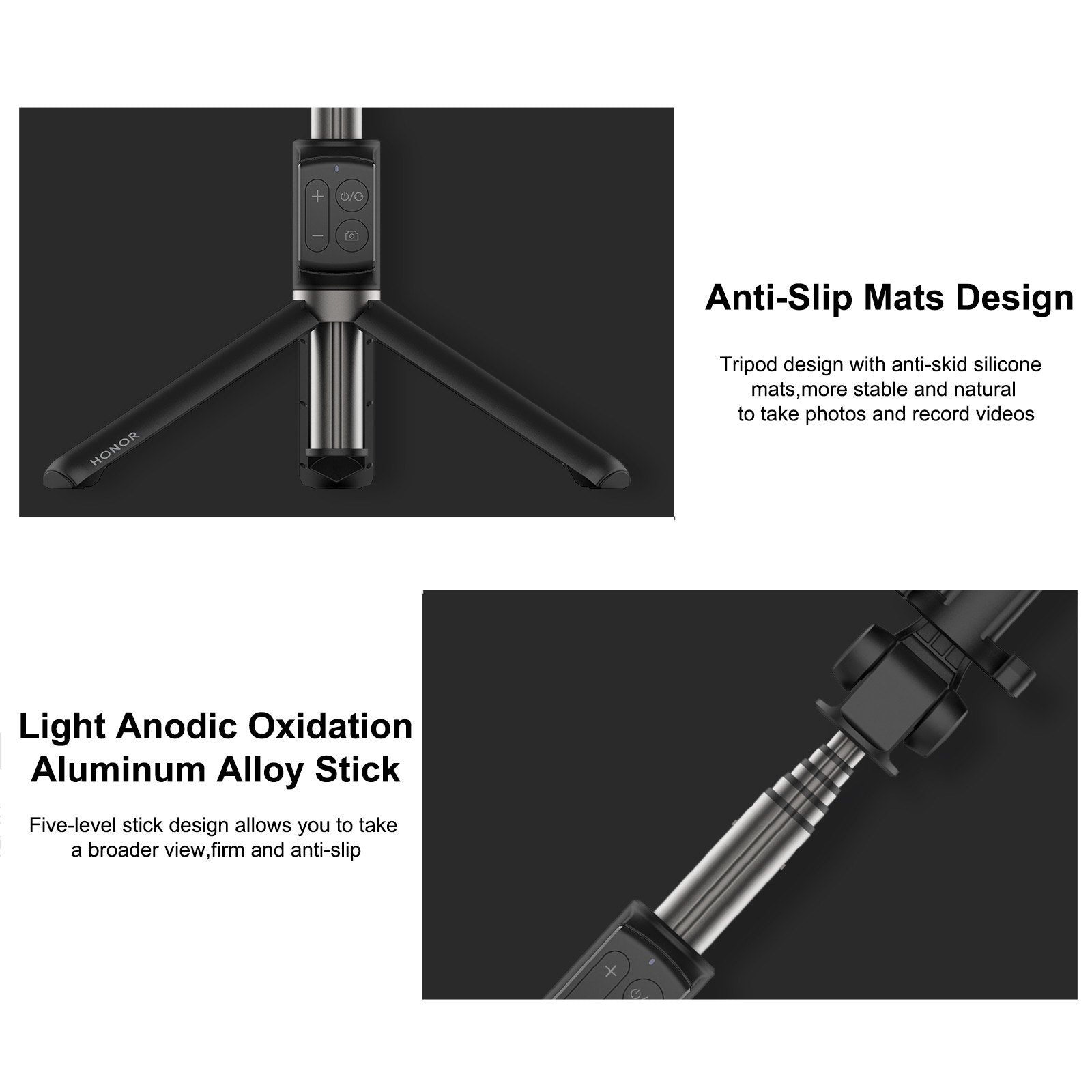 Five-Level Aluminum Alloy Pull Rod: Lightweight,firm and anti-slip.Five-level stick design up to 640mm allows you to take a broader view.