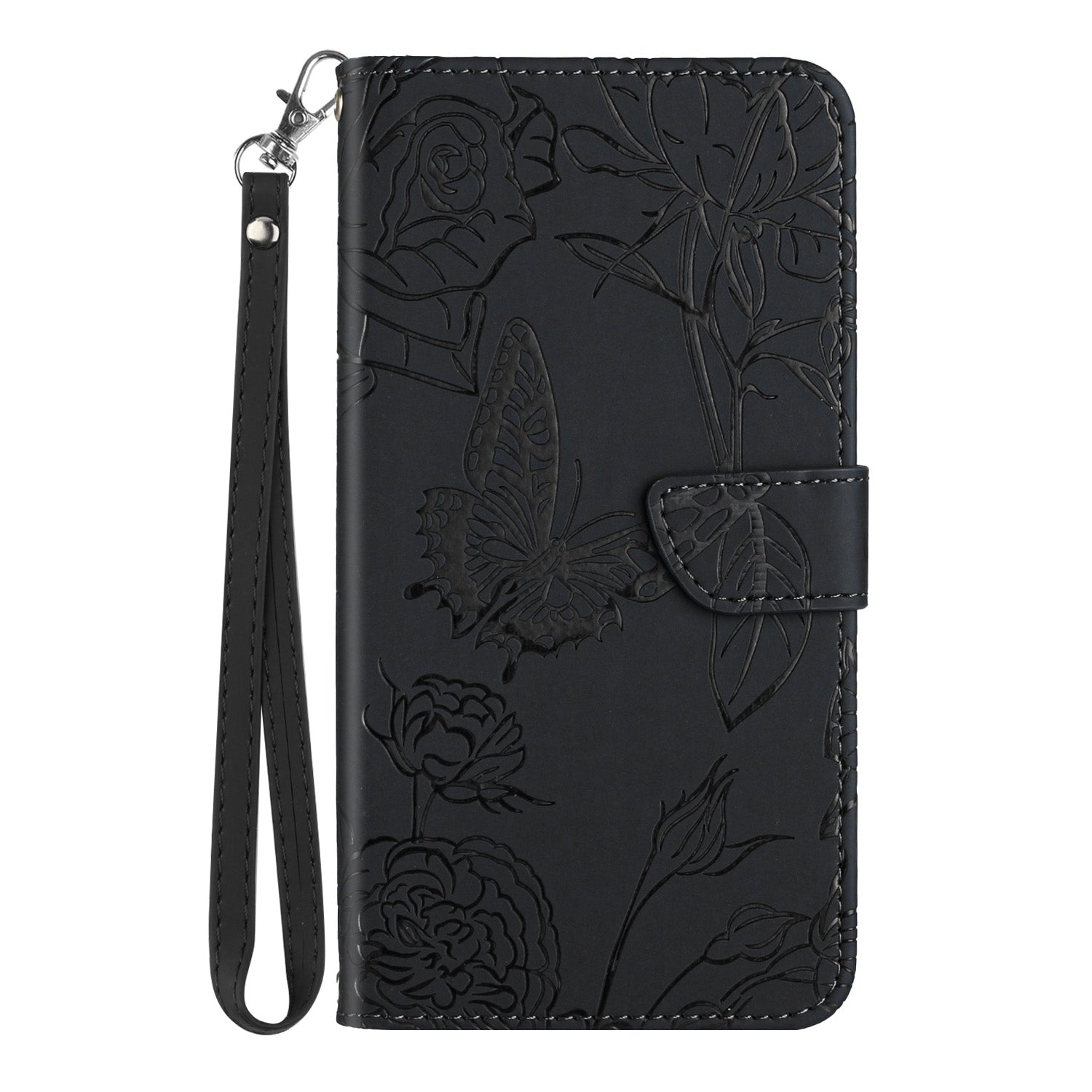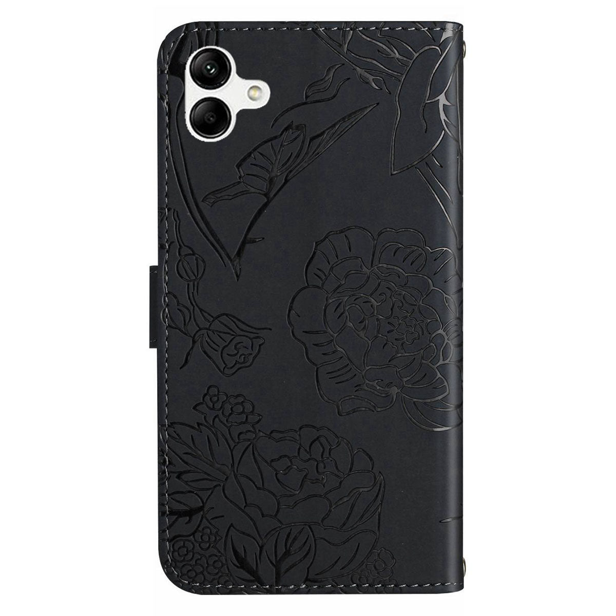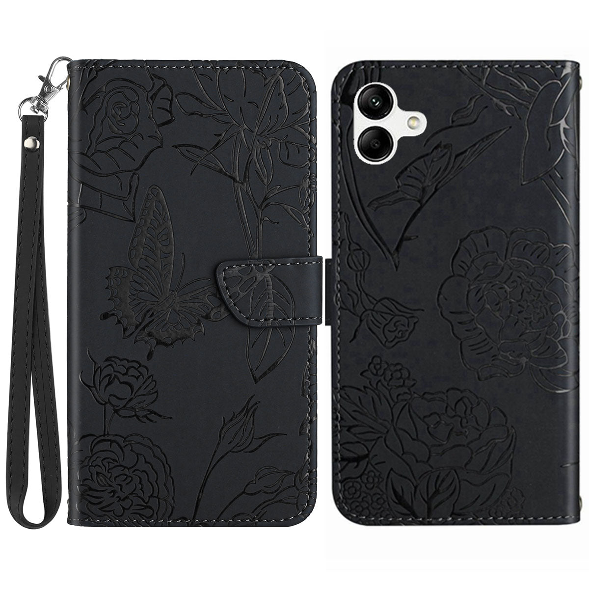 HT03 For Samsung Galaxy A06 Leather Case with Hand Strap Butterfly Flower Imprint - Black