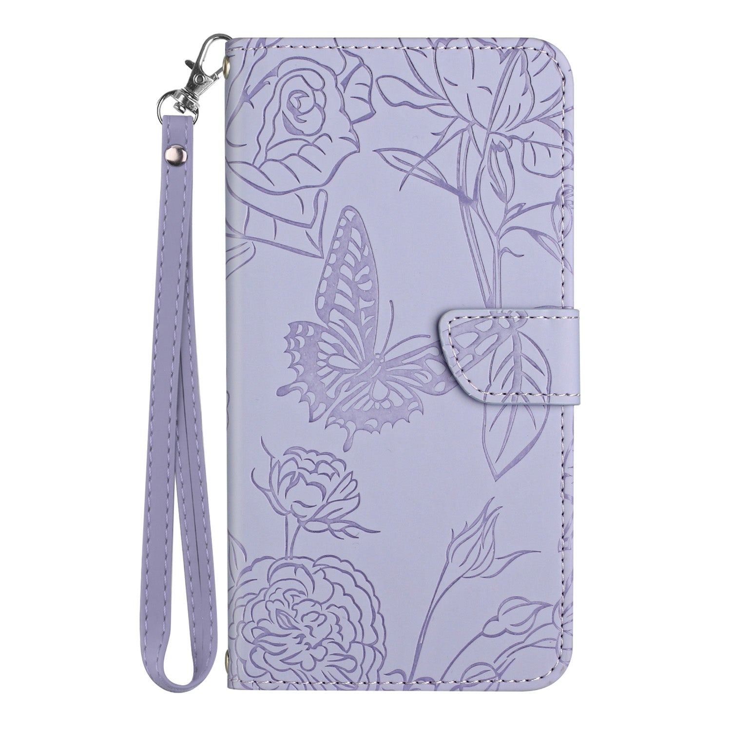 HT03 For Samsung Galaxy A06 Leather Case with Hand Strap Butterfly Flower Imprint - Purple