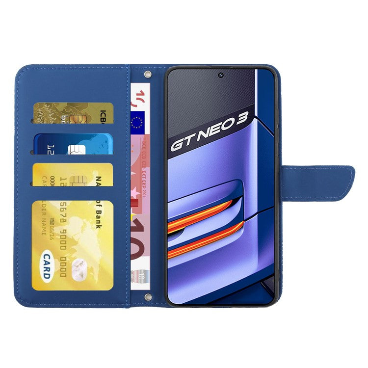 HT03 Mobile Phone Case for Realme GT Neo 3 5G, Skin-touch PU Leather Butterfly Flowers Imprinting Wallet Phone Cover Stand with Shoulder Strap - Blue