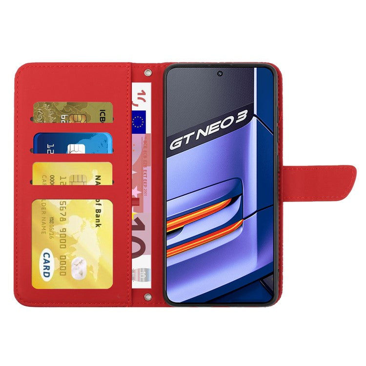 HT03 Mobile Phone Case for Realme GT Neo 3 5G, Skin-touch PU Leather Butterfly Flowers Imprinting Wallet Phone Cover Stand with Shoulder Strap - Red