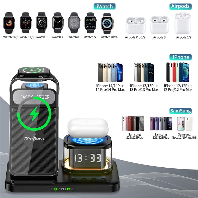 - Multifunctional 5-in-1 Design: This versatile device combines multiple functionalities into one compact and convenient unit, including wireless charging and night light features