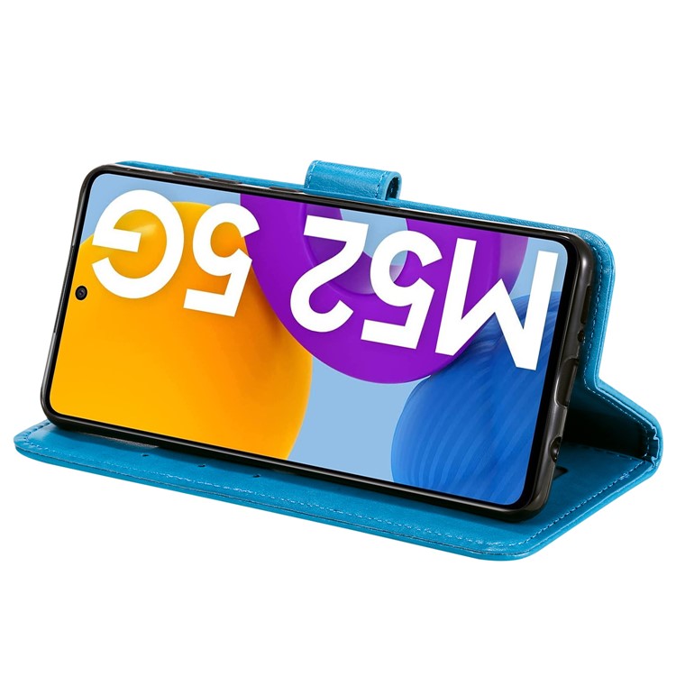 Imprinted Mandala Flower Stylish Anti-fall Wallet Stand Leather Cover Phone Shell with Handy Strap for Samsung Galaxy M52 5G - Blue