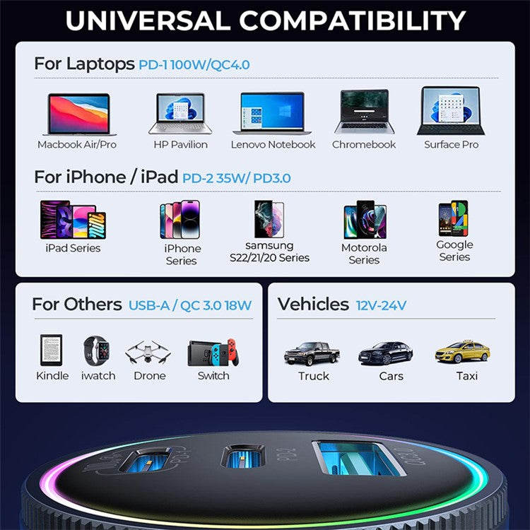 JOYROOM JR-CCN07 120W Super Fast Charging 3-Port Car Charger 2 Type-C + USB Car Charger Set with Type-C to Type-C Data Cable