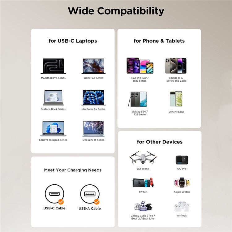 - Universal Compatibility: Compatible with a wide range of devices, including smartphones, tablets, laptops, and more, for versatile charging options
