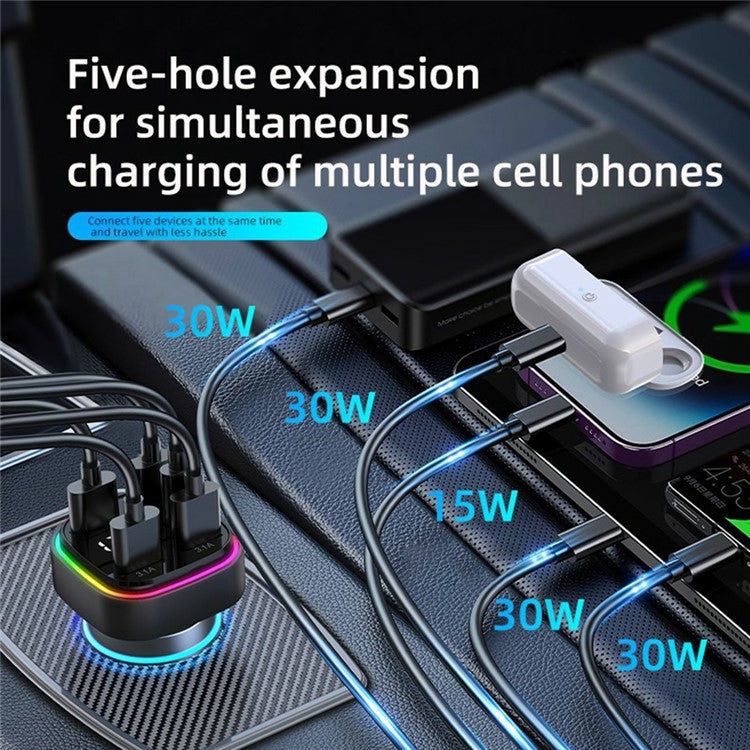 K34 5 Port USB Car Charger(4 USB+Type C) Cigarette Lighter Adapter with LED Display - Black