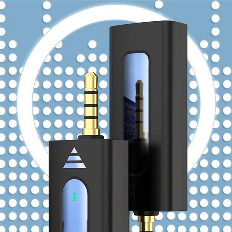 - 1. First, press and hold for 3 seconds to turn on the device, and insert the audio head of the receiver into the audio hole of the mobile phone or speaker. The green light flashes to indicate that it is in the waiting state;