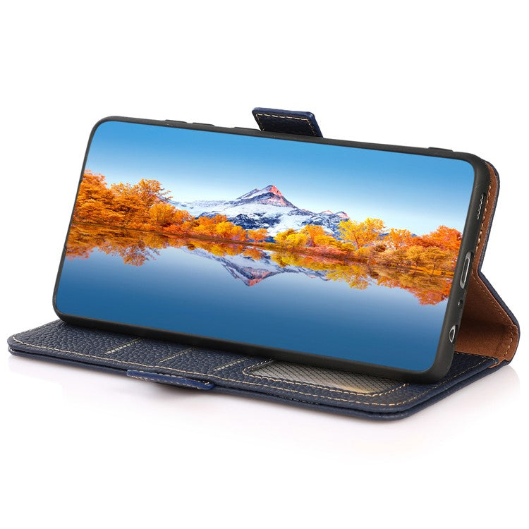 KHAZNEH For Google Pixel 7a RFID Blocking Phone Stand Case Genuine Cow Leather Wallet Drop-proof Cover - Blue
