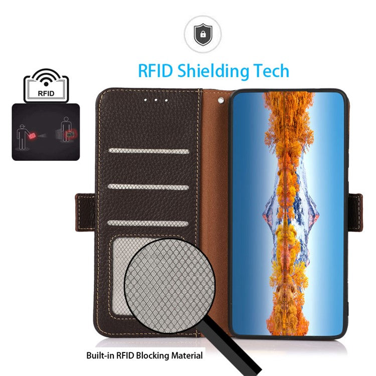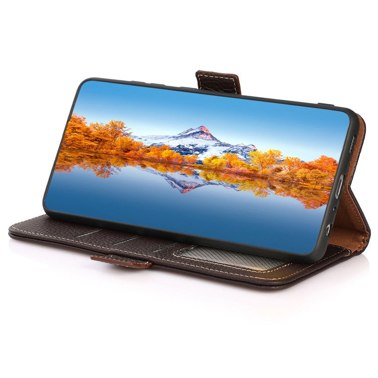 KHAZNEH For Google Pixel 7a RFID Blocking Phone Stand Case Genuine Cow Leather Wallet Drop-proof Cover - Brown
