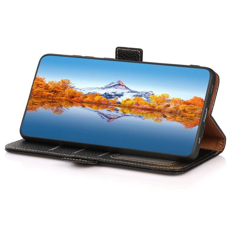 KHAZNEH for Honor X40i 5G RFID Blocking Flip Wallet Phone Case Litchi Texture Genuine Leather Stand Magnetic Closure Protective Cover - Black