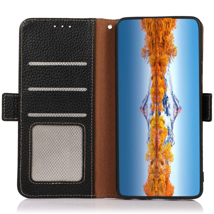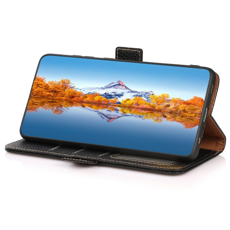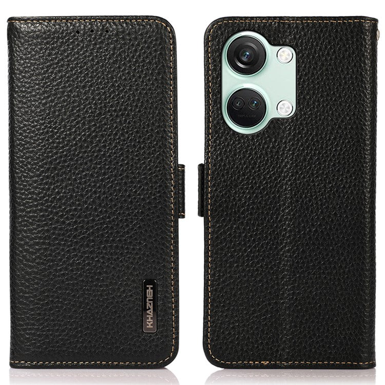 KHAZNEH Genuine Cow Leather Phone Case for OnePlus Nord 3 5G / Ace 2V , RFID Blocking Stand Wallet Litchi Texture Cover - Black