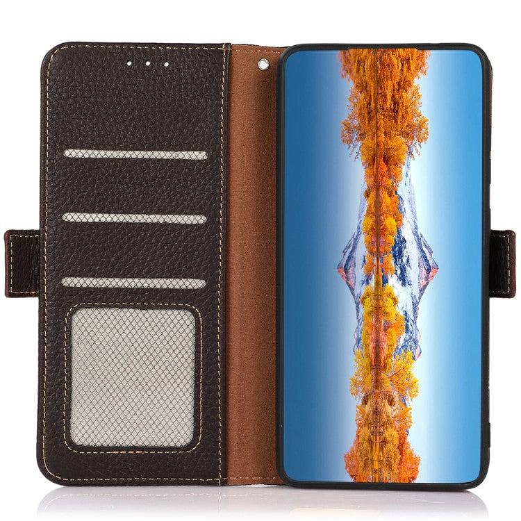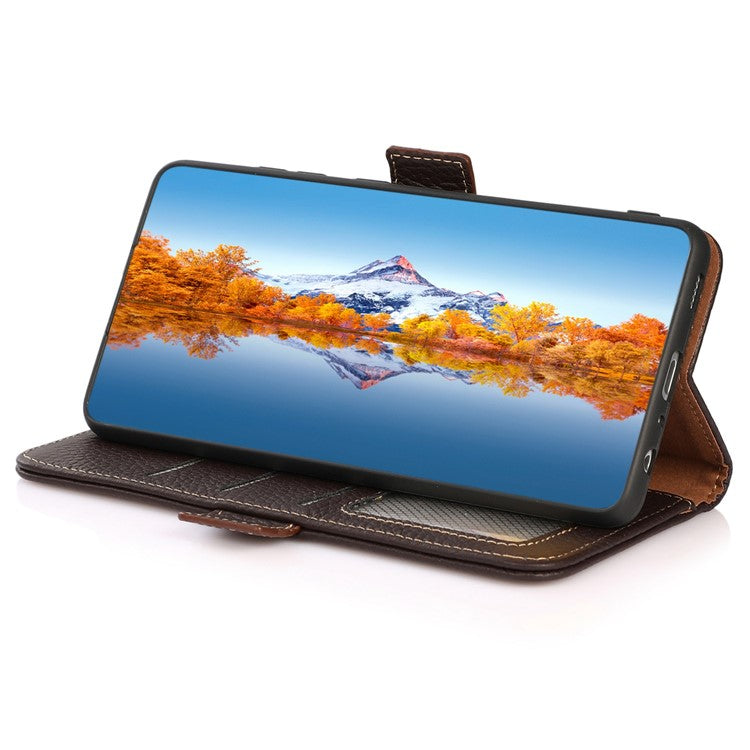 KHAZNEH Genuine Cow Leather Phone Case for OnePlus Nord 3 5G / Ace 2V , RFID Blocking Stand Wallet Litchi Texture Cover - Brown