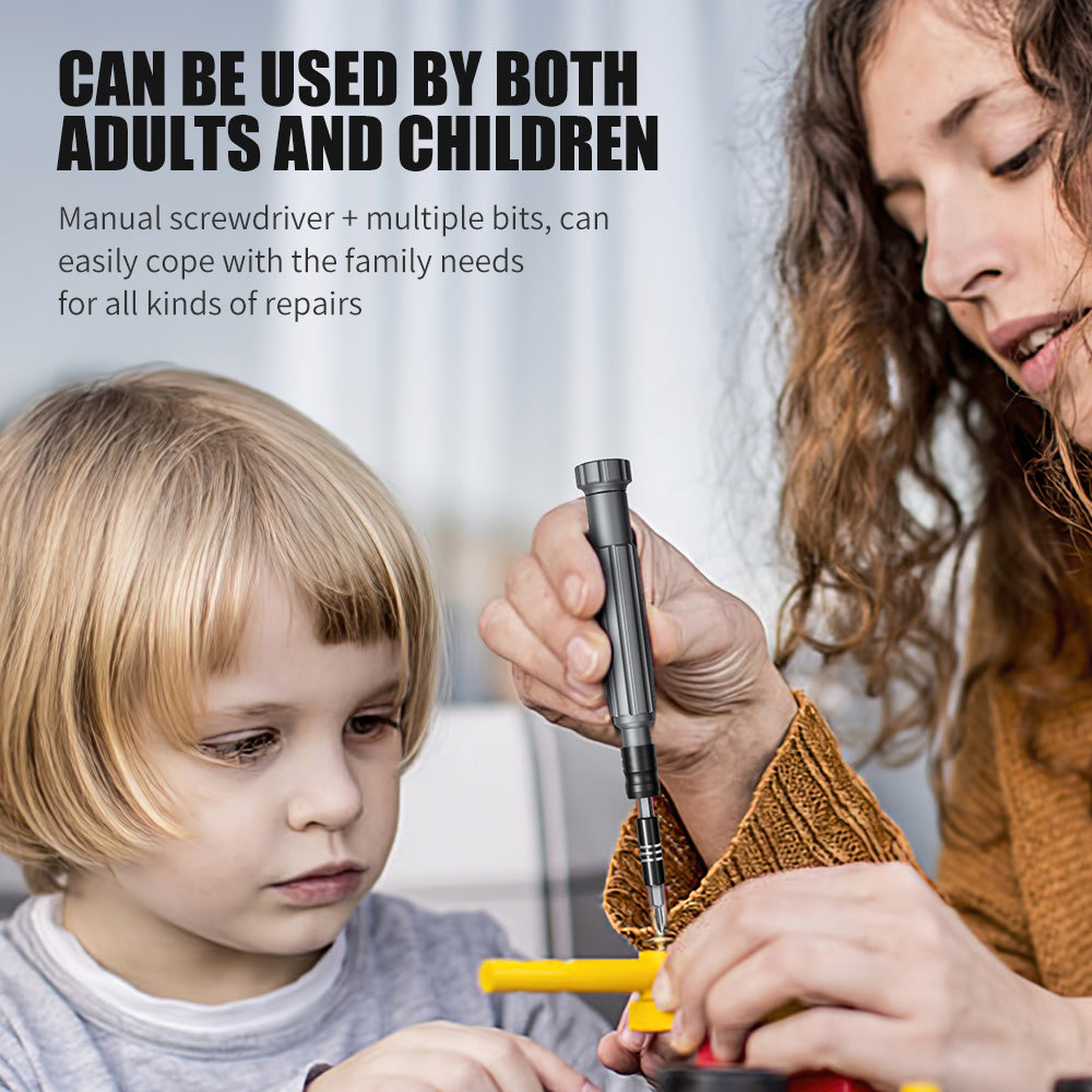- Can Be Used By Both Adults And Children: Manual screwdriver + multiple bits, can easily cope with the family needs for all kinds of repairs