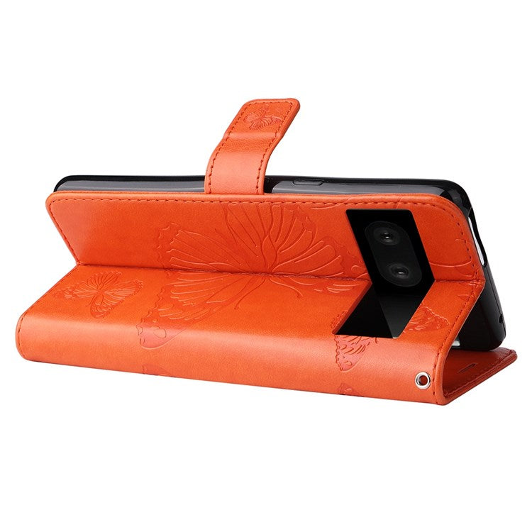 KT Imprinting Flower Series-2 Cell Phone Cover for Google Pixel 7, Anti-dust PU Leather Imprinted Butterfly Mobile Phone Case Wallet - Orange