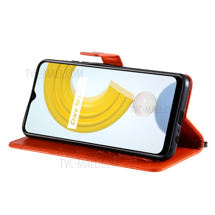 KT Imprinting Flower Series-2 Imprint Butterflies Wallet Stand Leather Flip Cover Protective Case with Handy Strap for Realme C21 - Orange