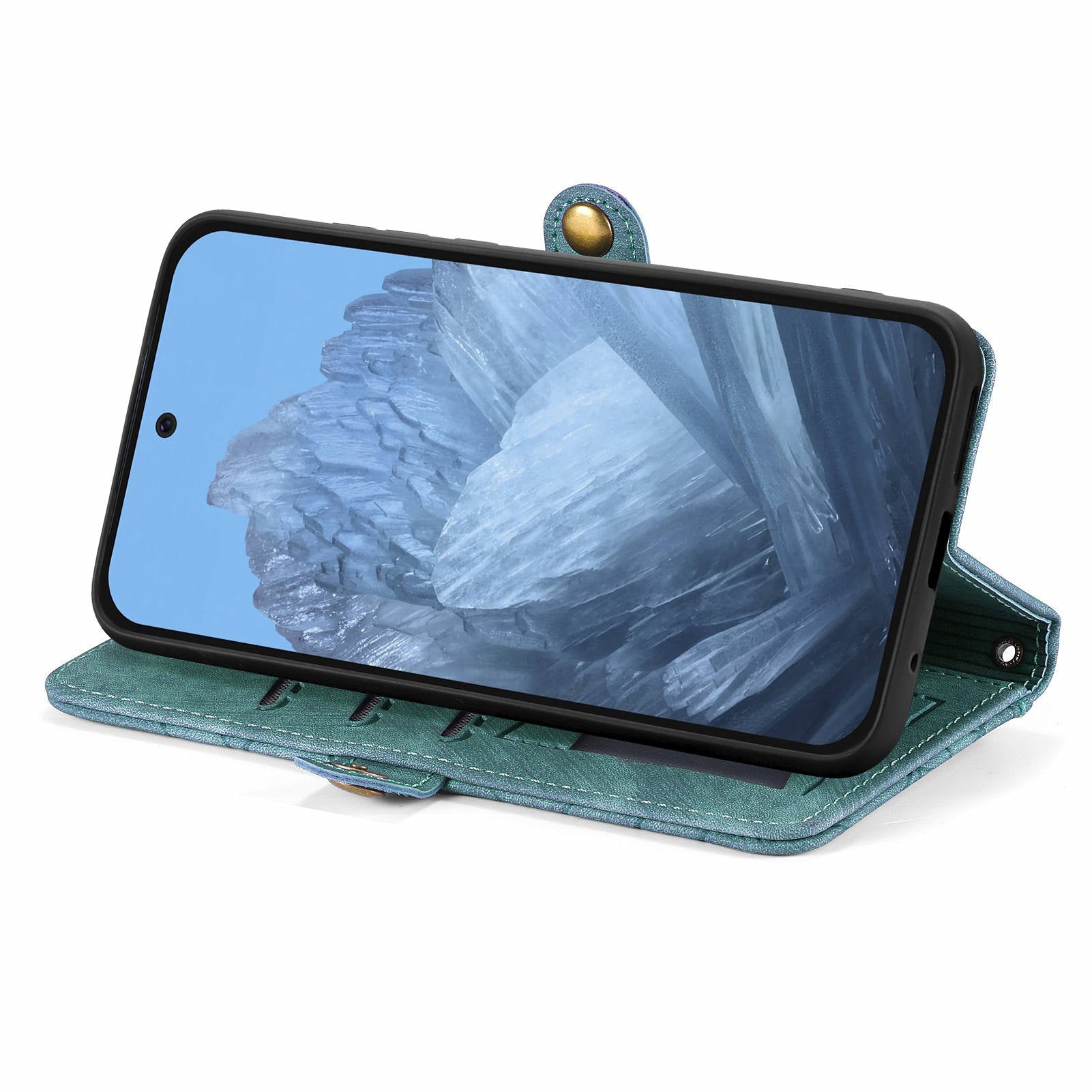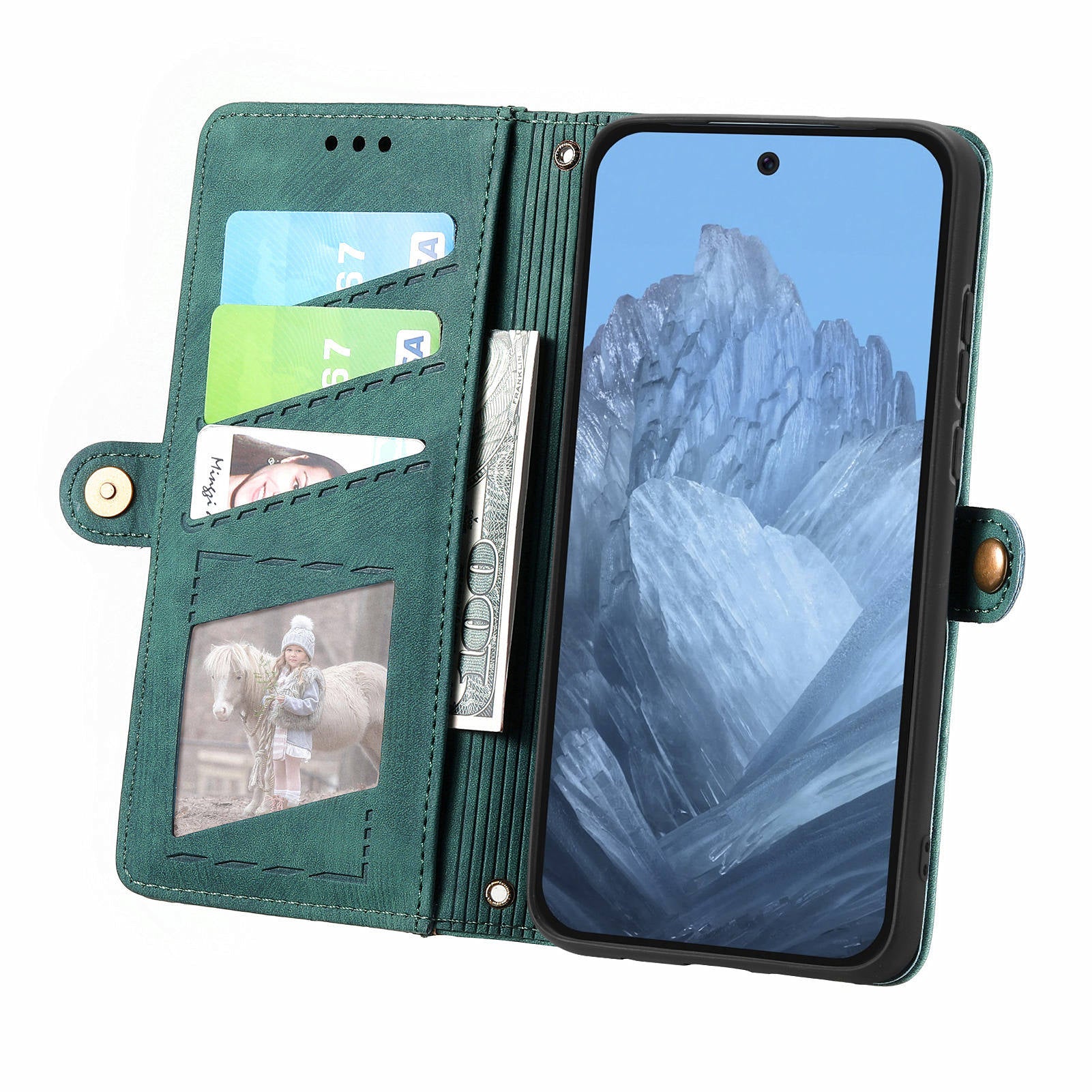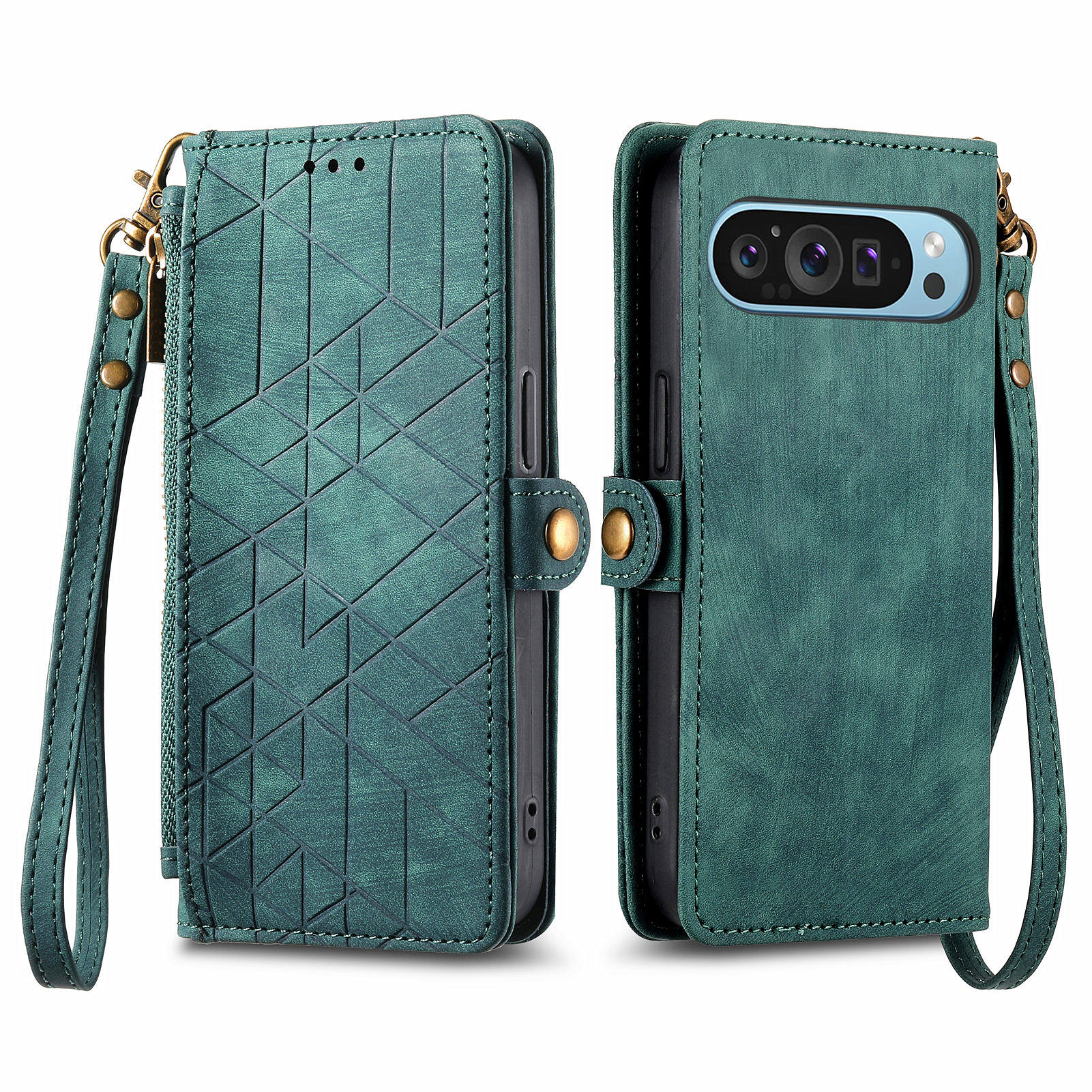 Leather Case for Google Pixel 9 Pro Zipper Pocket Geometry Mobile Phone Wallet Cover - Green