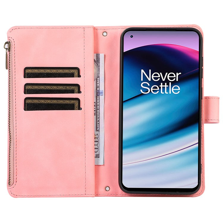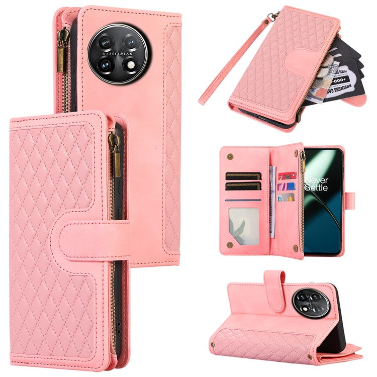 Leather Case for OnePlus 11 5G Shell Rhombus Imprint Zipper Pocket Phone Cover with Hand Strap - Rose Gold