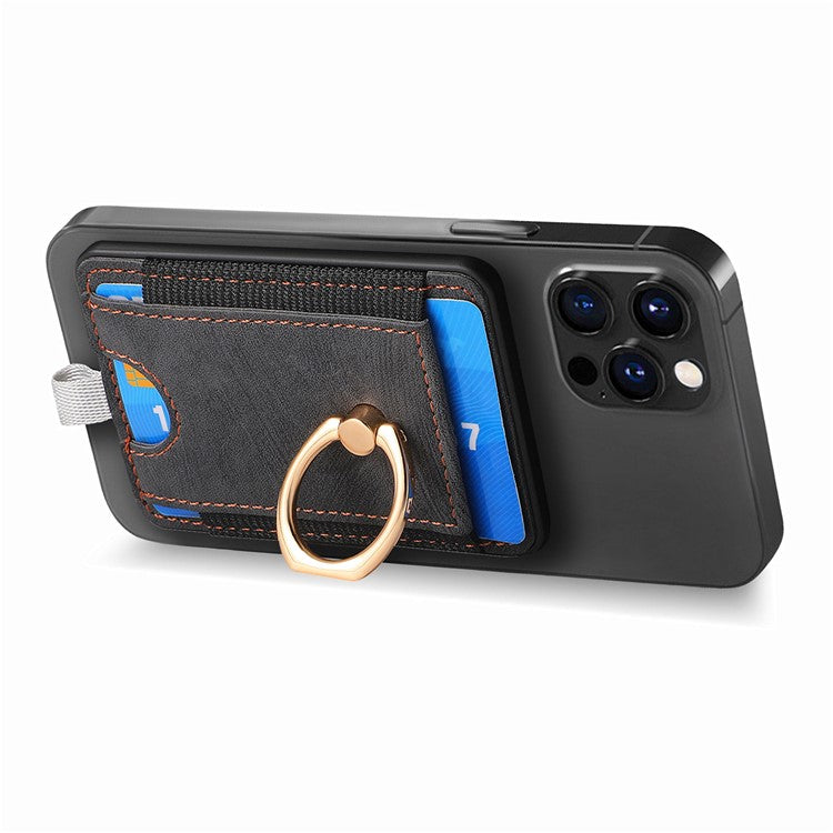 Magnetic Card Holder Ring Kickstand Retro Texture PU Leather Card Bag - Black