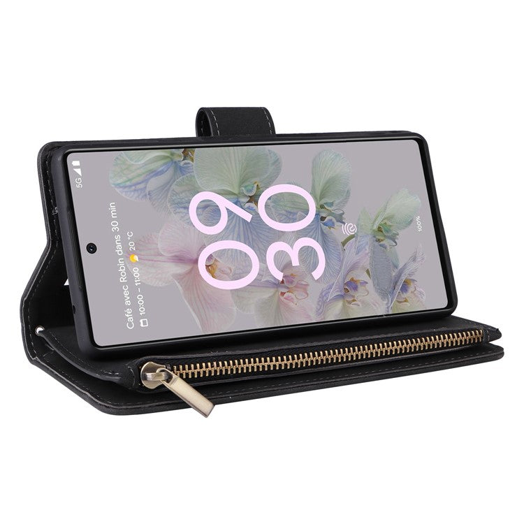 Multiple Card Slots Phone Cover for Google Pixel 6a, PU Leather Wallet Stand Zipper Pocket Shell - Black