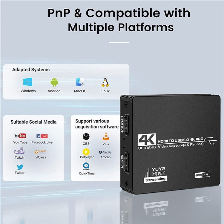 - USB 3.0 capture card capable of capturing 4K 1080P60, with loop-out support for 4K30 and 4K60YUV. It supports YUY2 and MJPEG capture formats without HDCP decoding. Upgraded for gaming capture, it records up to 4K and is backward compatible with 1080P@60fps, ensuring flawless and exciting live streaming experiences. The 1:1 video capture provides clearer images, offering a seamless and thrilling broadcasting experience