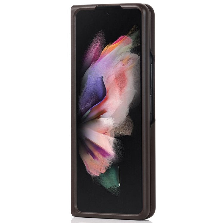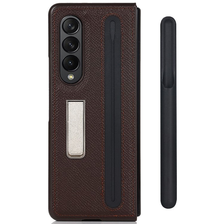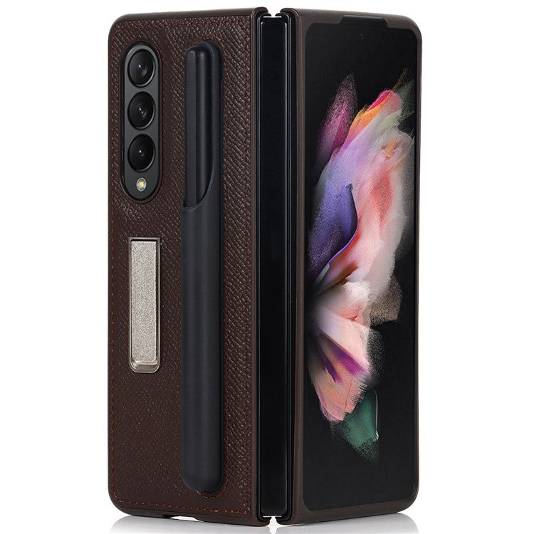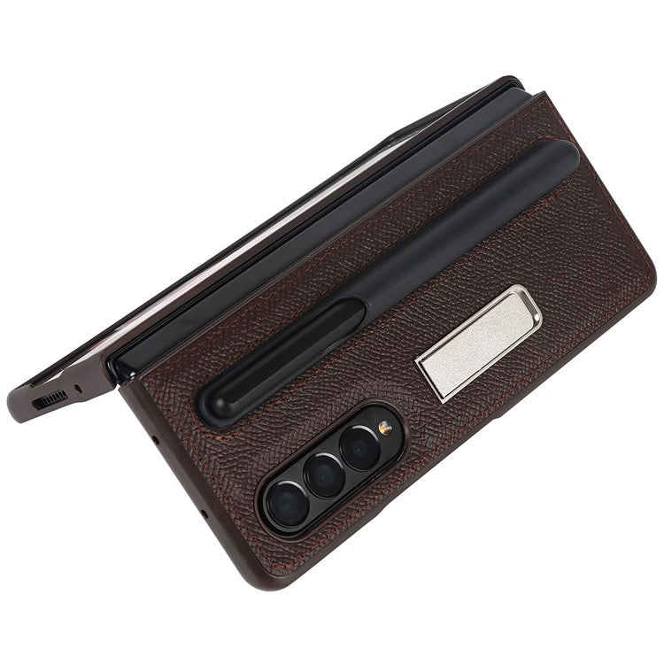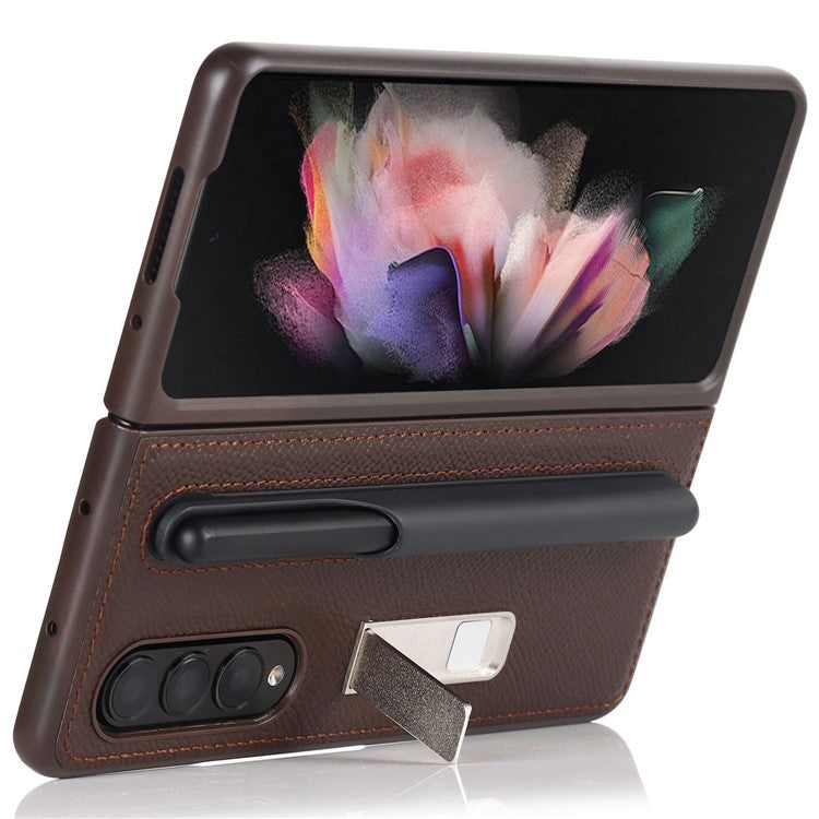 Palm Print Genuine Leather + PC Phone Case Kickstand Cover with Detachable Pen Slot for Samsung Galaxy Z Fold3 5G - Brown