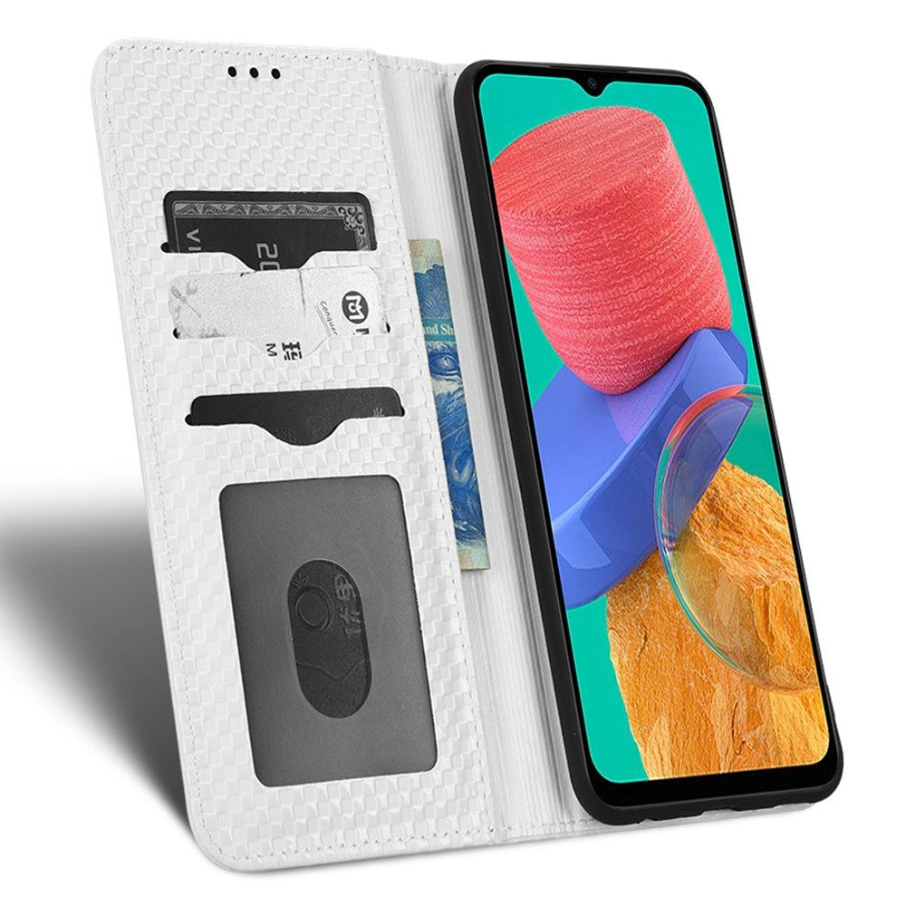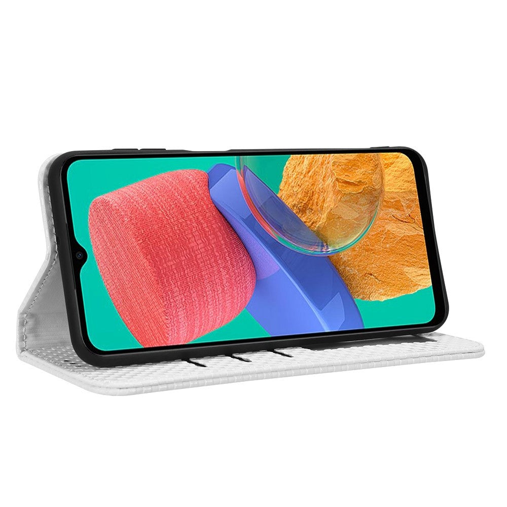 Phone Flip Wallet Case For Samsung Galaxy M33 5G (Global Version), Anti-wear PU Leather Magnetic Auto-absorbed Grid Texture Phone Cover Stand - White