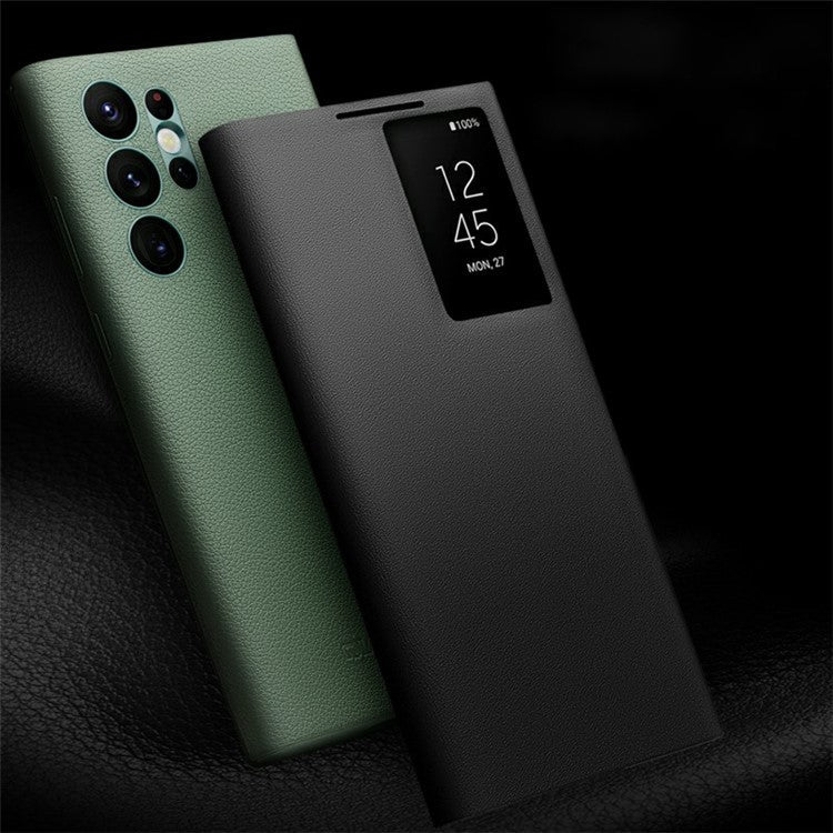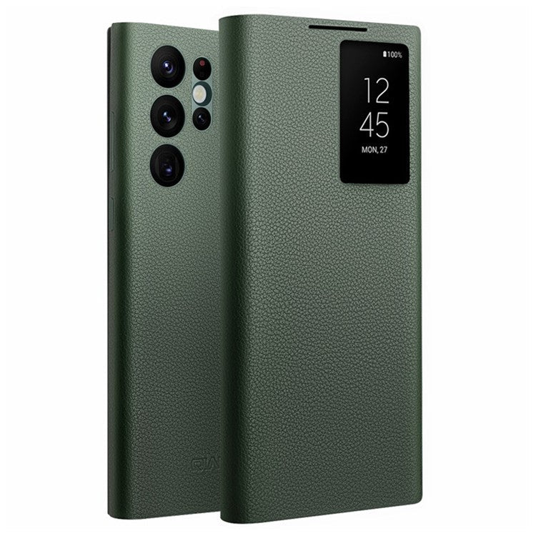 QIALINO For Samsung Galaxy S22 Ultra 5G View Window Cell Phone Case Smart Auto Wake Up / Sleep Genuine Cowhide Leather Phone Flip Cover - Green