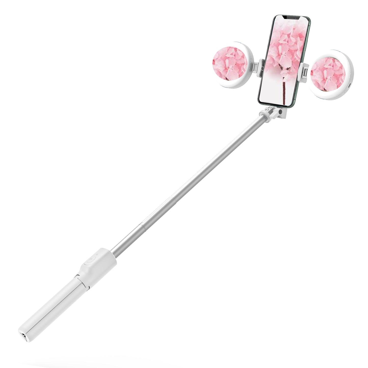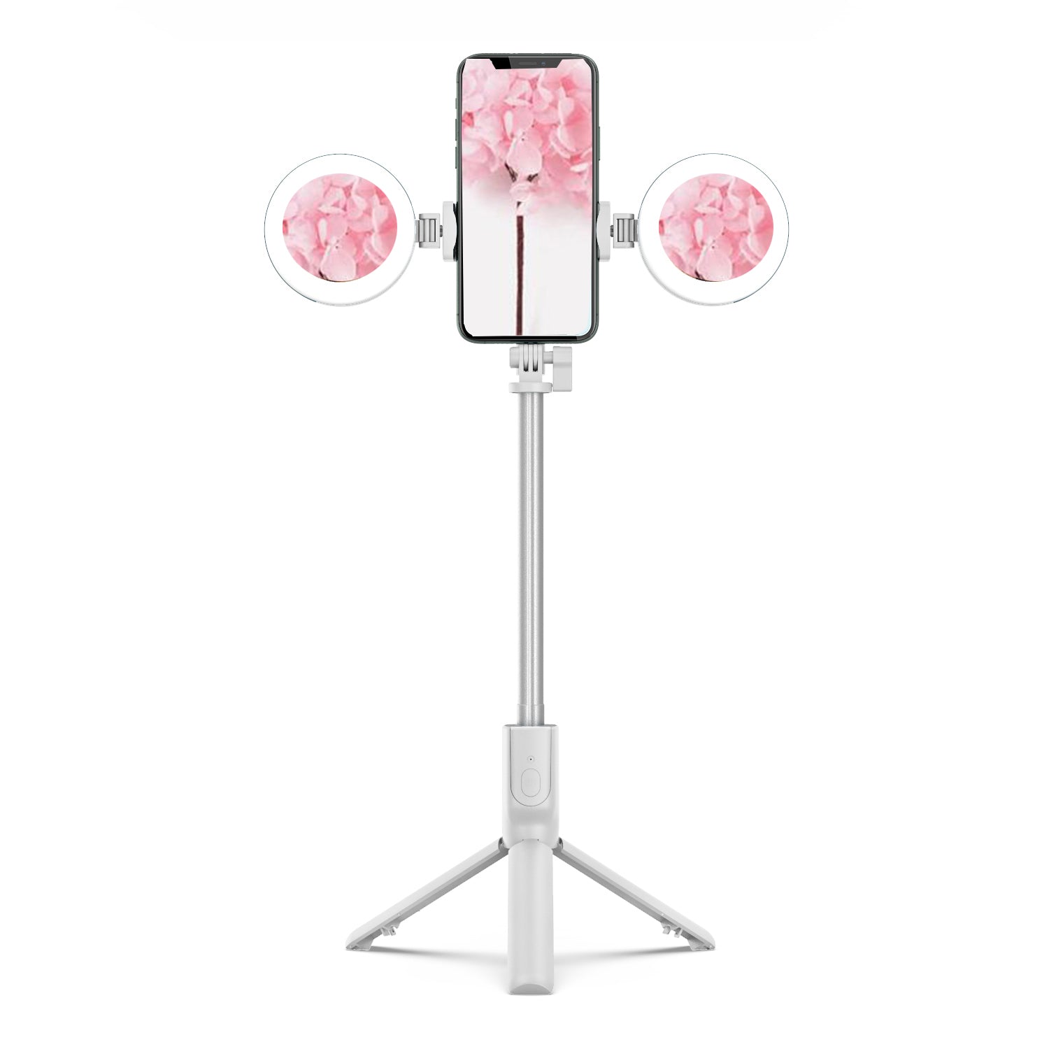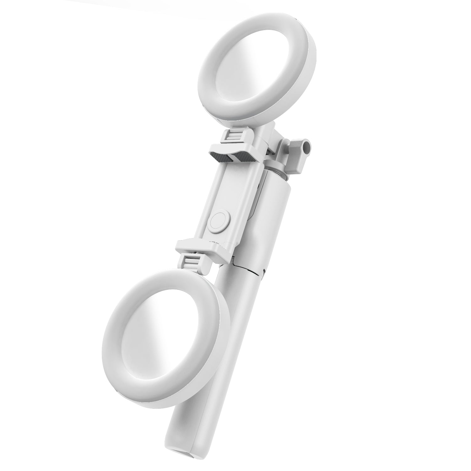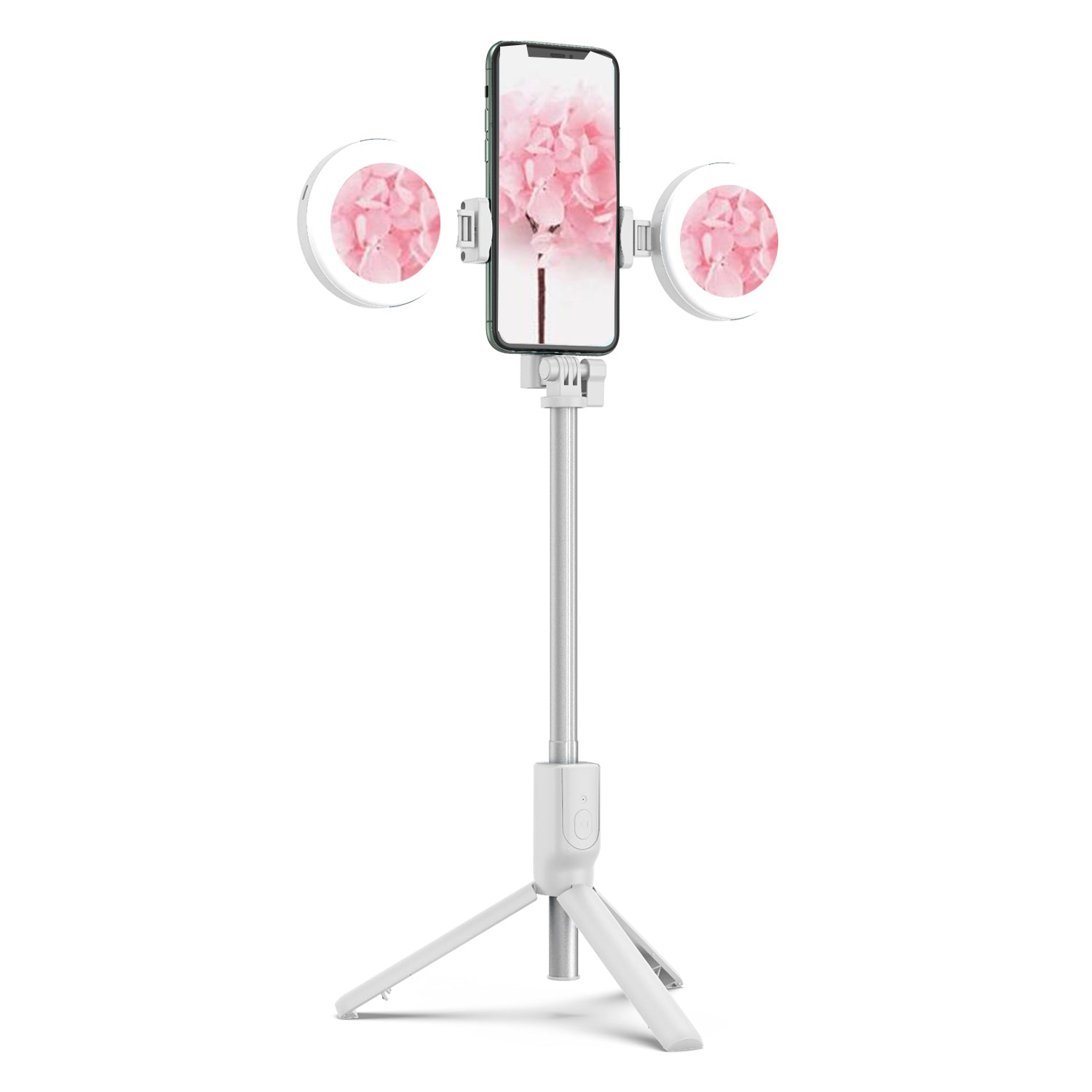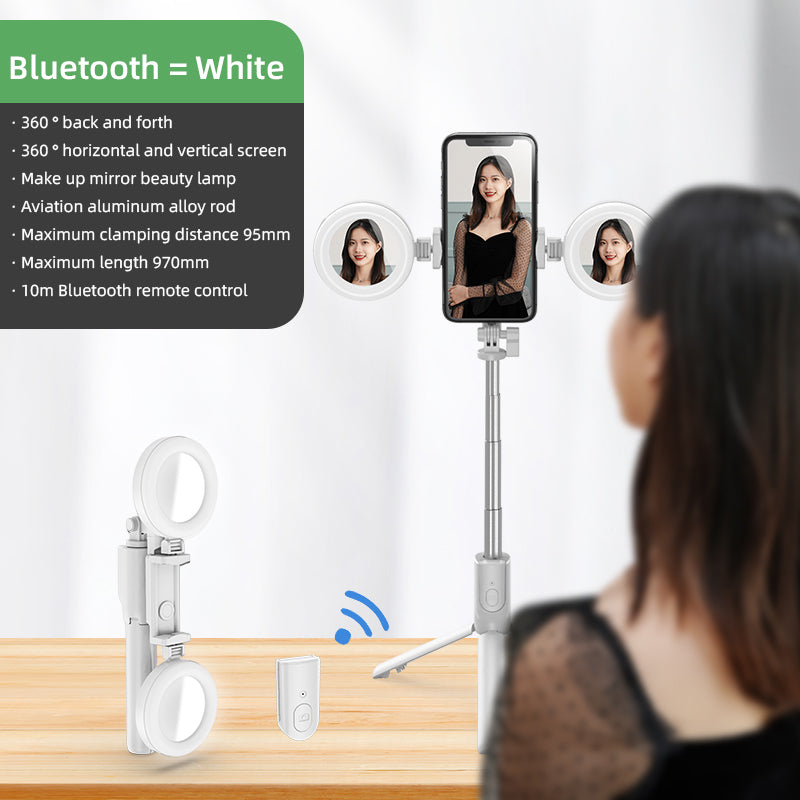 R12 Extendable Bluetooth Selfie Stick Tripod Stand with Double Ring Light Makeup Mirror - White