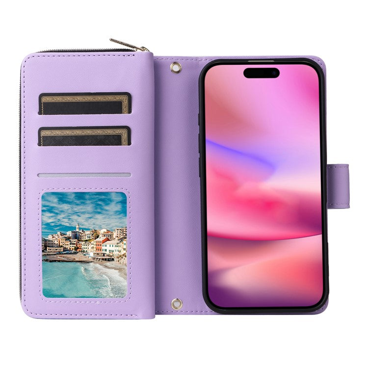 R20 For iPhone 16 Plus Case Zipper Wallet 9 Card Slots PU Leather Phone Cover - Light Purple