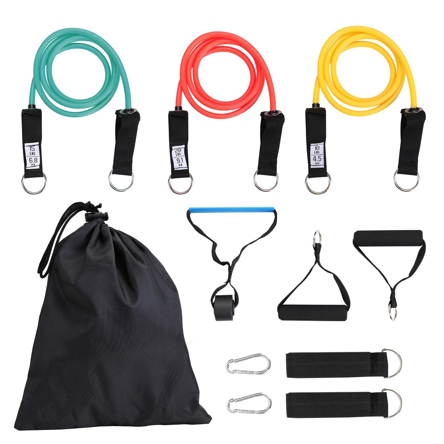 - Type 1: 1pcs Red 20lbs Resistance Belt + 1pcs Green 15lbs Resistance Belt + 1pcs yellow 10lbs Resistance Belt + 2 pcs Foam handles + Receive bag + 2pcs Ankle Straps + Door Anchor