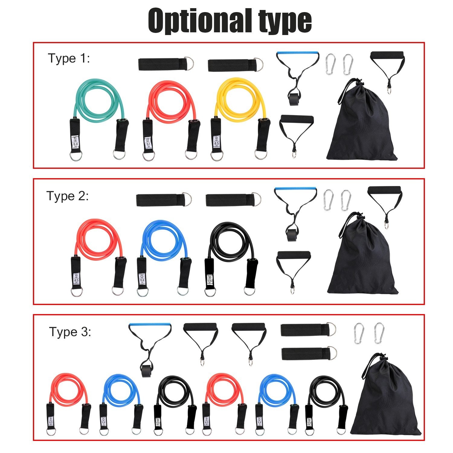 - Type 3: 2pcs Red 20lbs Resistance Belt + 2pcs Blue 25lbs Resistance Belt + 2pcs Black 30lbs Resistance Belt + 4 pcs Foam handles + Receive bag + 2pcs Ankle Straps + Door Anchor