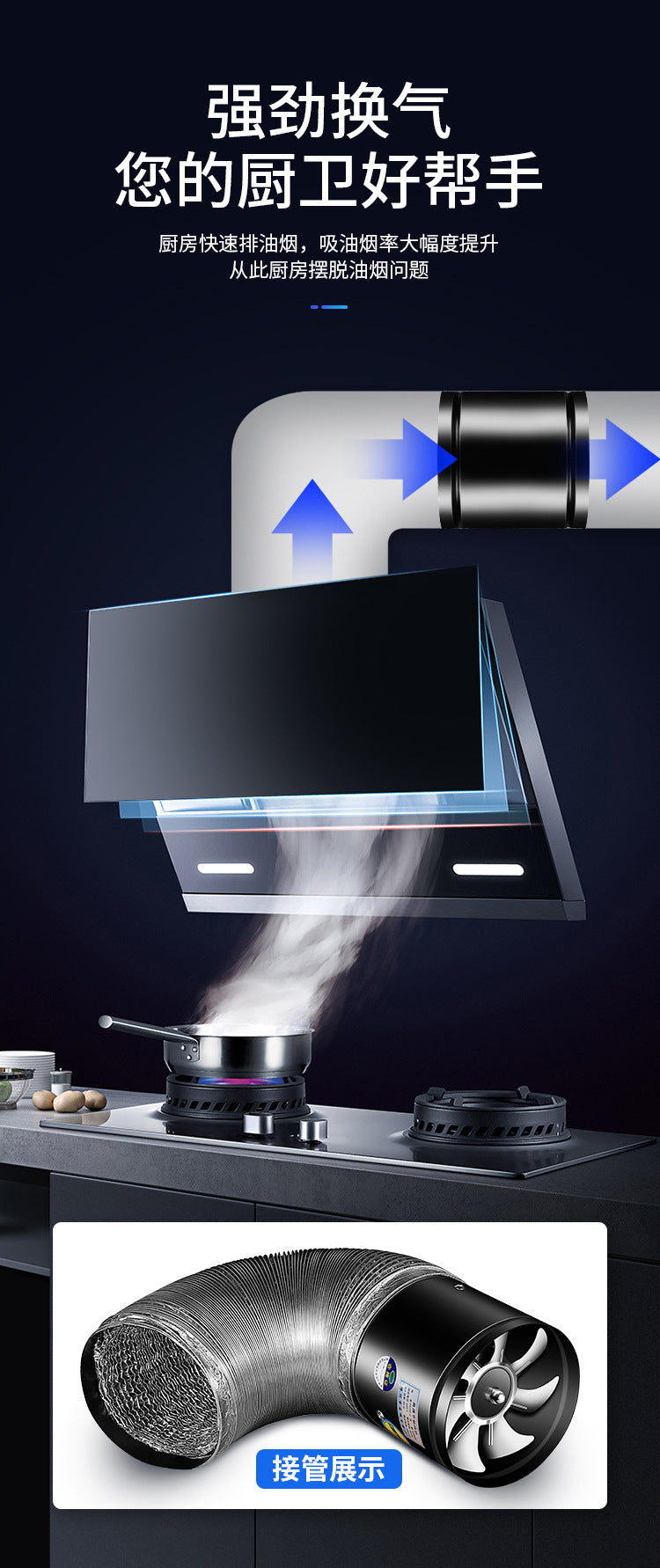 - The kitchen quickly discharges oil fume, and the oil fume absorption rate is greatly improved. From then on, the kitchen gets rid of the oil fume problem.