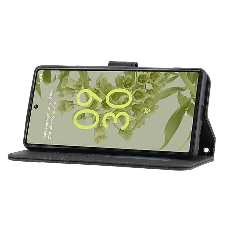 Scratch-resistant PU Leather Imprinted Pattern Wallet Case Stand Magnetic Flip Cover with Wrist Strap for Google Pixel 6a - Black
