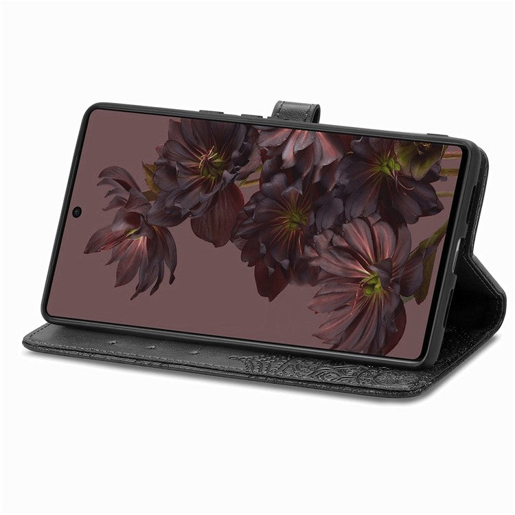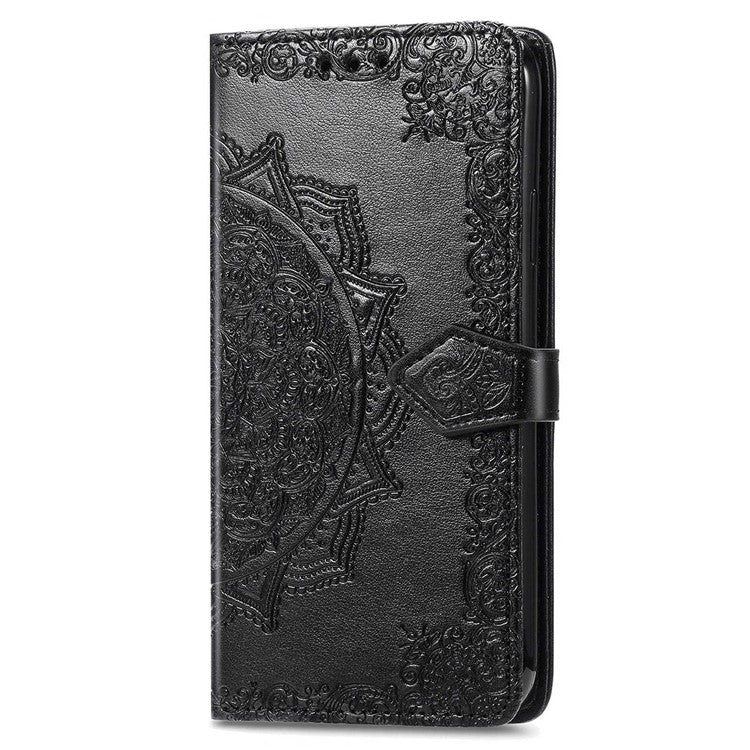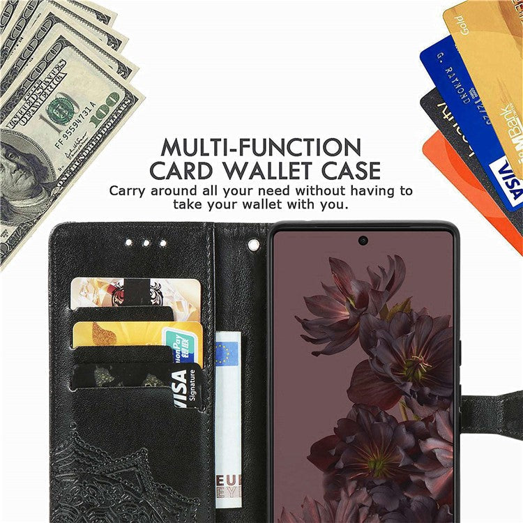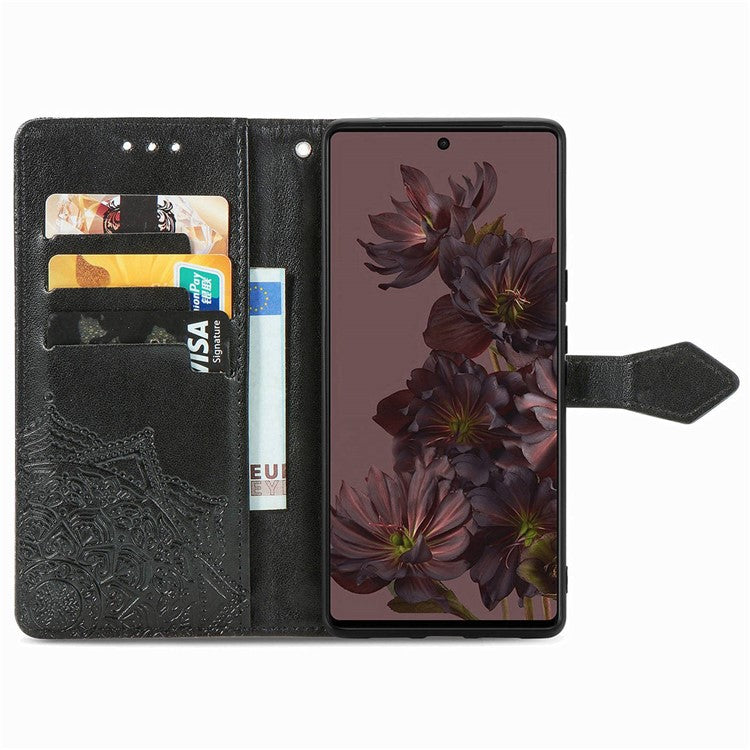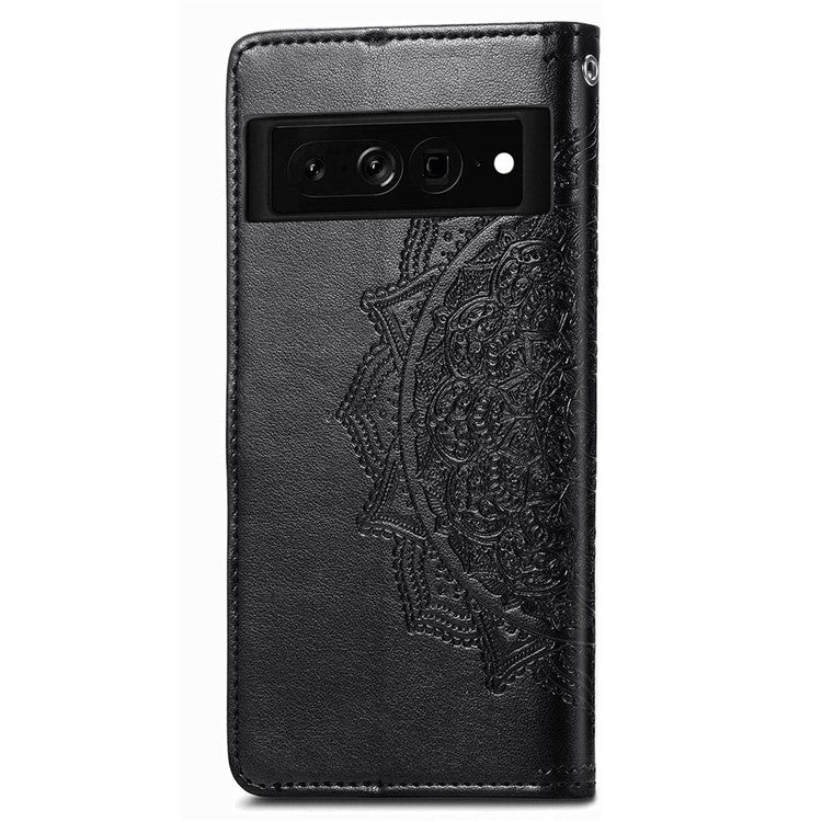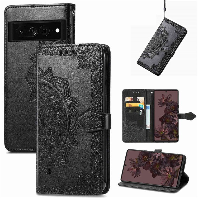 Stand Wallet Leather Case for Google Pixel 7 5G, Embossed Mandala Pattern Full Protection Inner TPU Phone Cover with Strap - Black