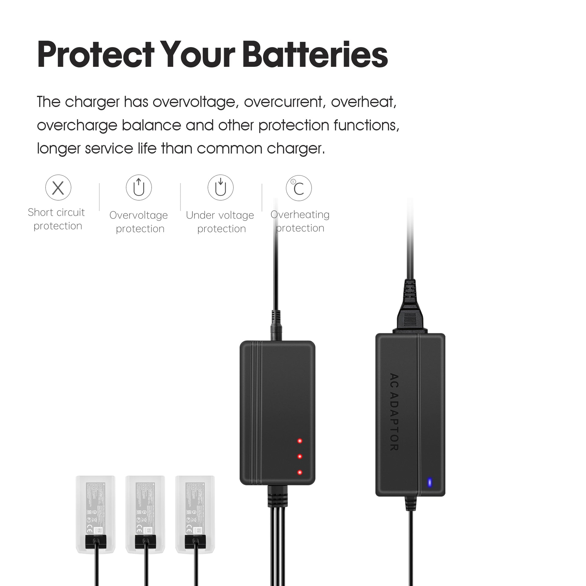 - 3 in 1 design, it can charge three sets of batteries at the same time, and the charging time only takes about an hour