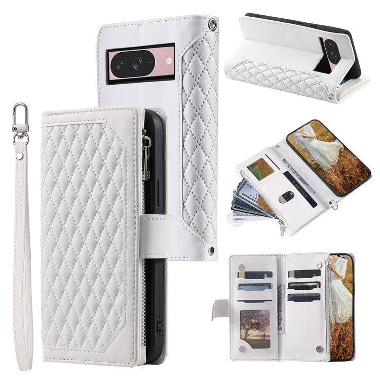Style 005 For Google Pixel 9 / 9 Pro Wallet Case Rhombus PU Leather Zipper Phone Cover - White