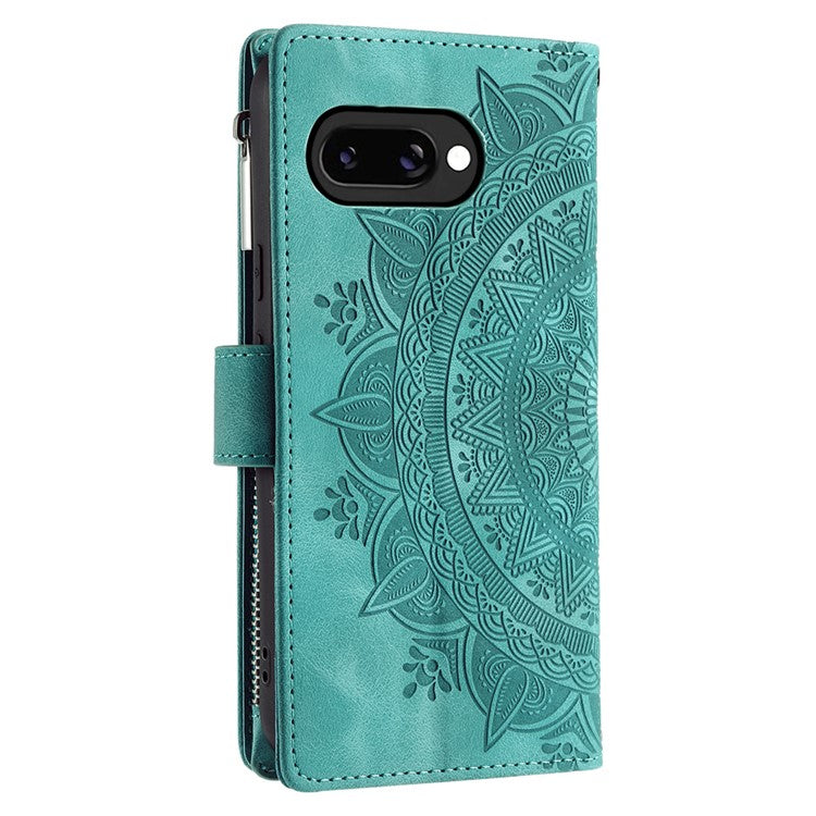 Style 006 For Google Pixel 9a Phone Case Mandala Flower Pattern PU Leather Zipper Wallet Stand Cover - Mint Green