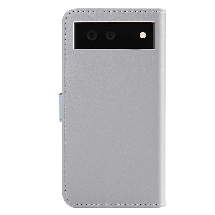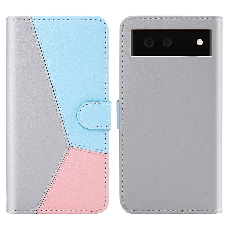 Stylish Tri-color Splicing Design Stand Wallet Full Protection Leather Cover Phone Case for Google Pixel 6 - Grey/Blue/Pink