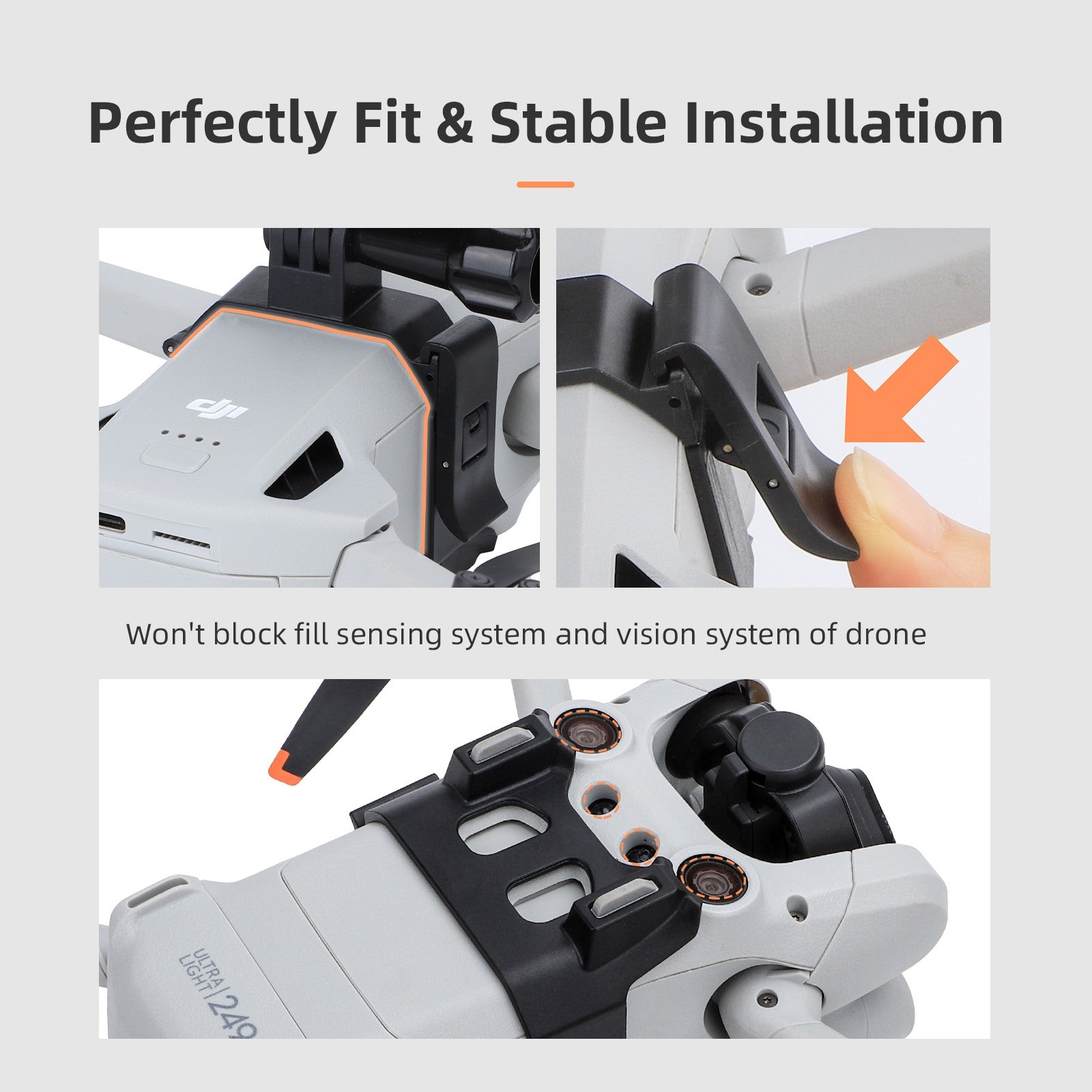 - One-piece molding, stable installation. Won't obscure the vision and sensing systems on the bottom of the drone