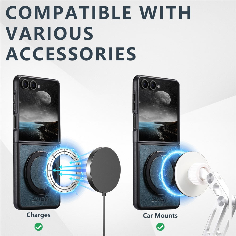 SUTENI G3 For Samsung Galaxy Z Flip7 5G Case Compatible with MagSafe Waxy Texture Rotating Kickstand Leather Phone Back Cover - Blue
