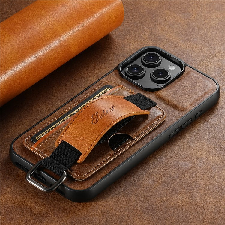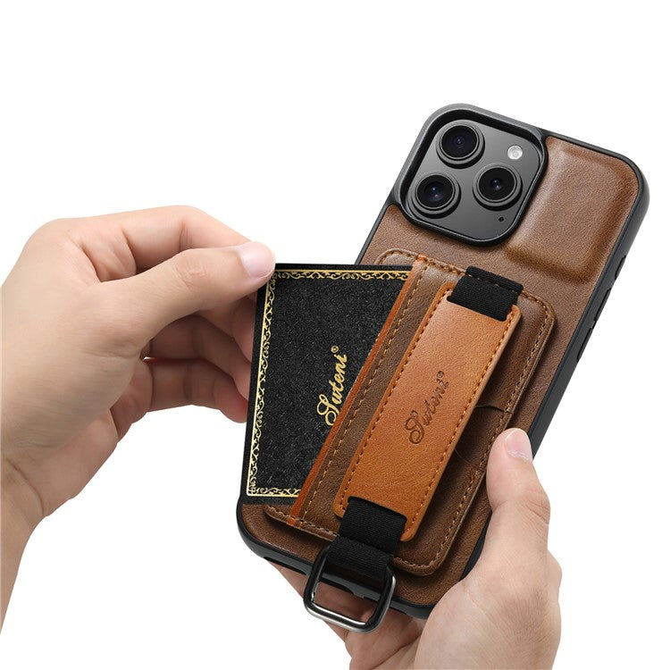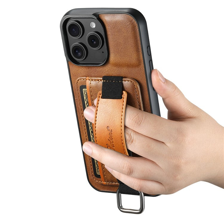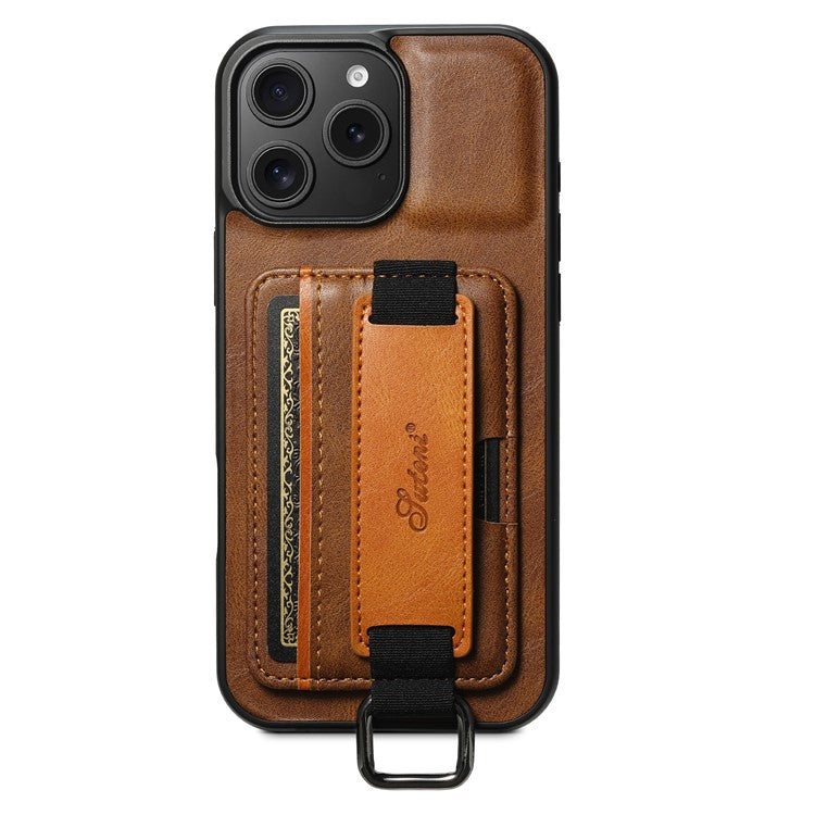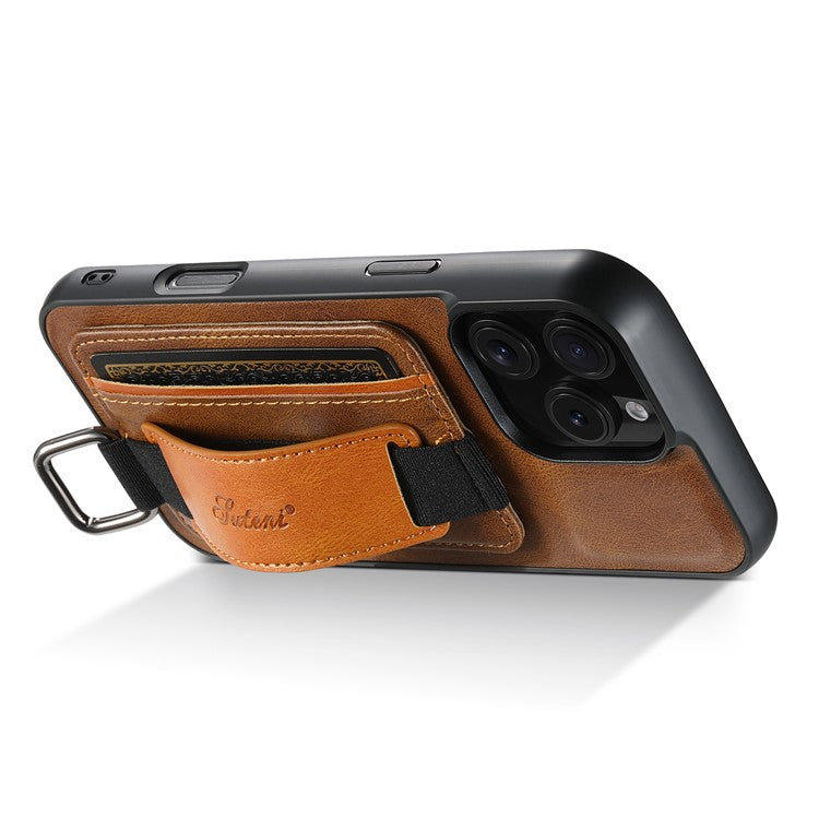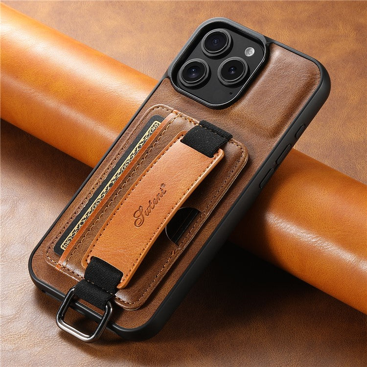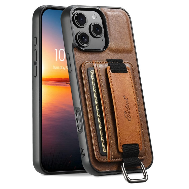 SUTENI H13 For iPhone 16 Pro Case Card Holder Wristband Waxy Texture Leather+TPU+PC Cover - Brown