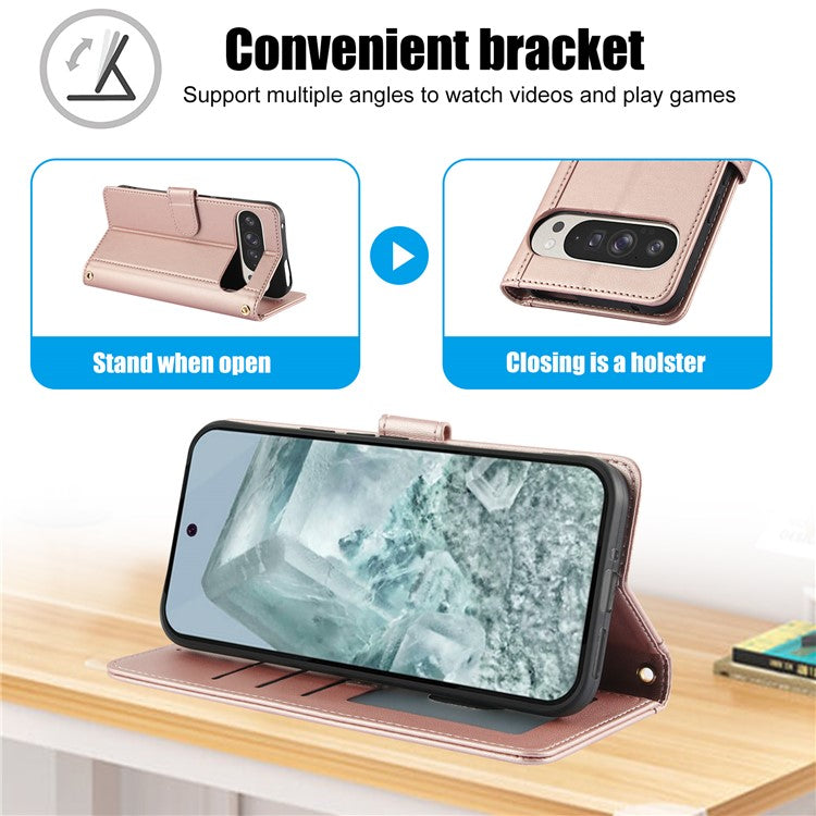 SY-003 For Google Pixel 9 Pro / Pixel 9 Case PU Leather Stand View Phone Wallet Cover with Hand Strap - Pink