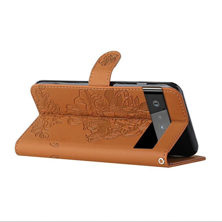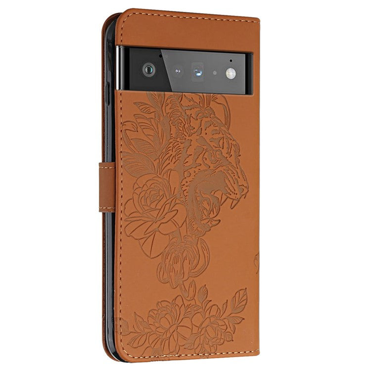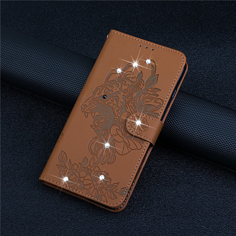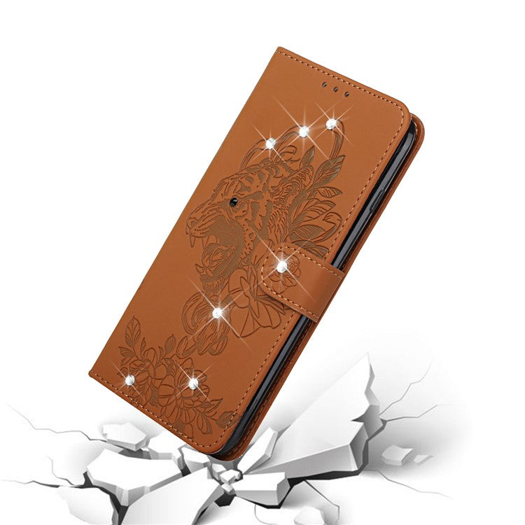 Tiger Head Imprinted Rhinestone Design Wallet Stand Leather Protective Phone Case Shell for Google Pixel 6 Pro - Brown