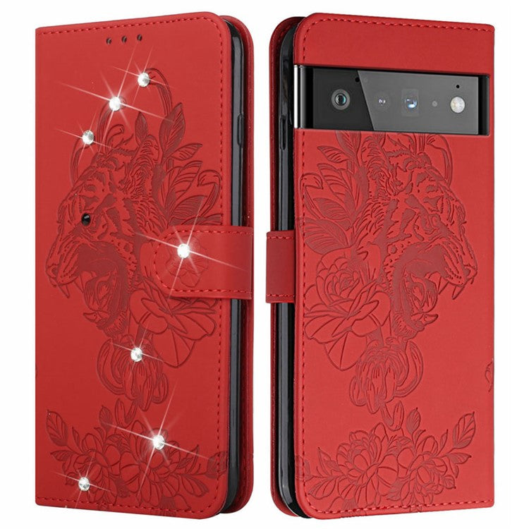 Tiger Head Imprinted Rhinestone Design Wallet Stand Leather Protective Phone Case Shell for Google Pixel 6 Pro - Red